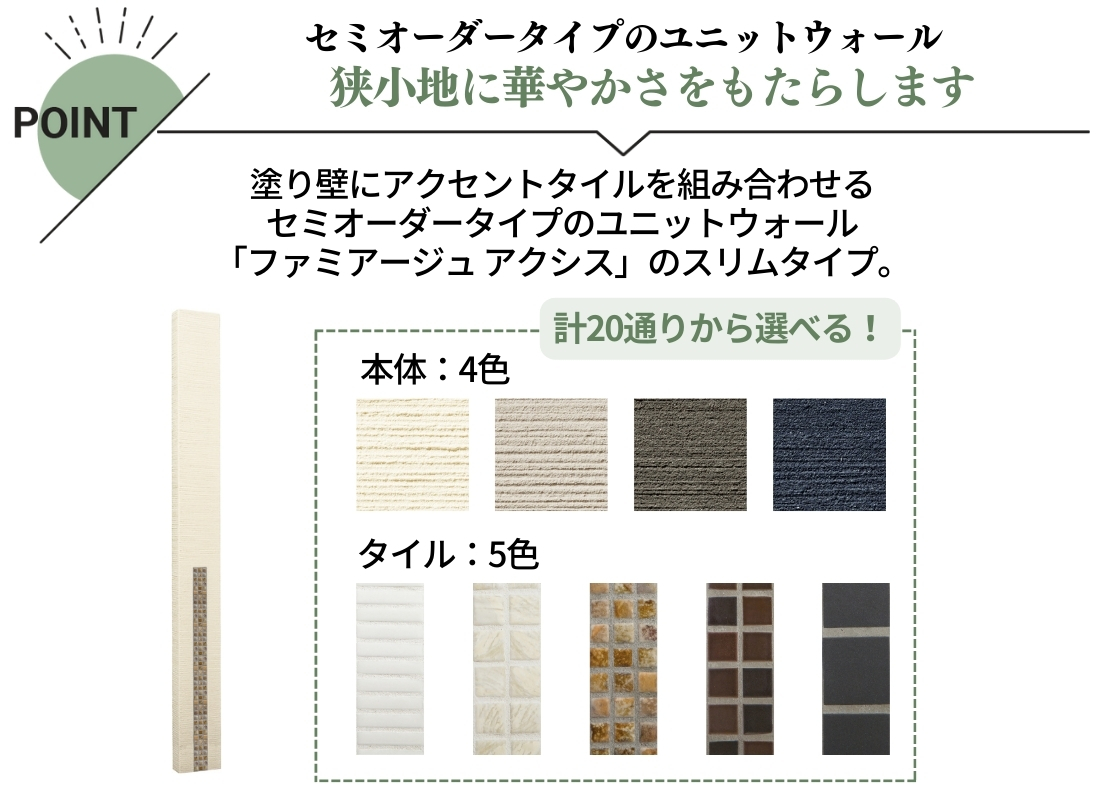 塗り壁にアクセントタイルを組み合わせるセミオーダータイプのユニットウォール「ファミアージュ アクシス」のスリムタイプ。