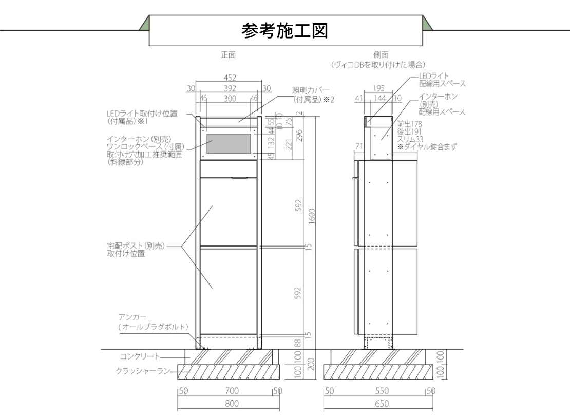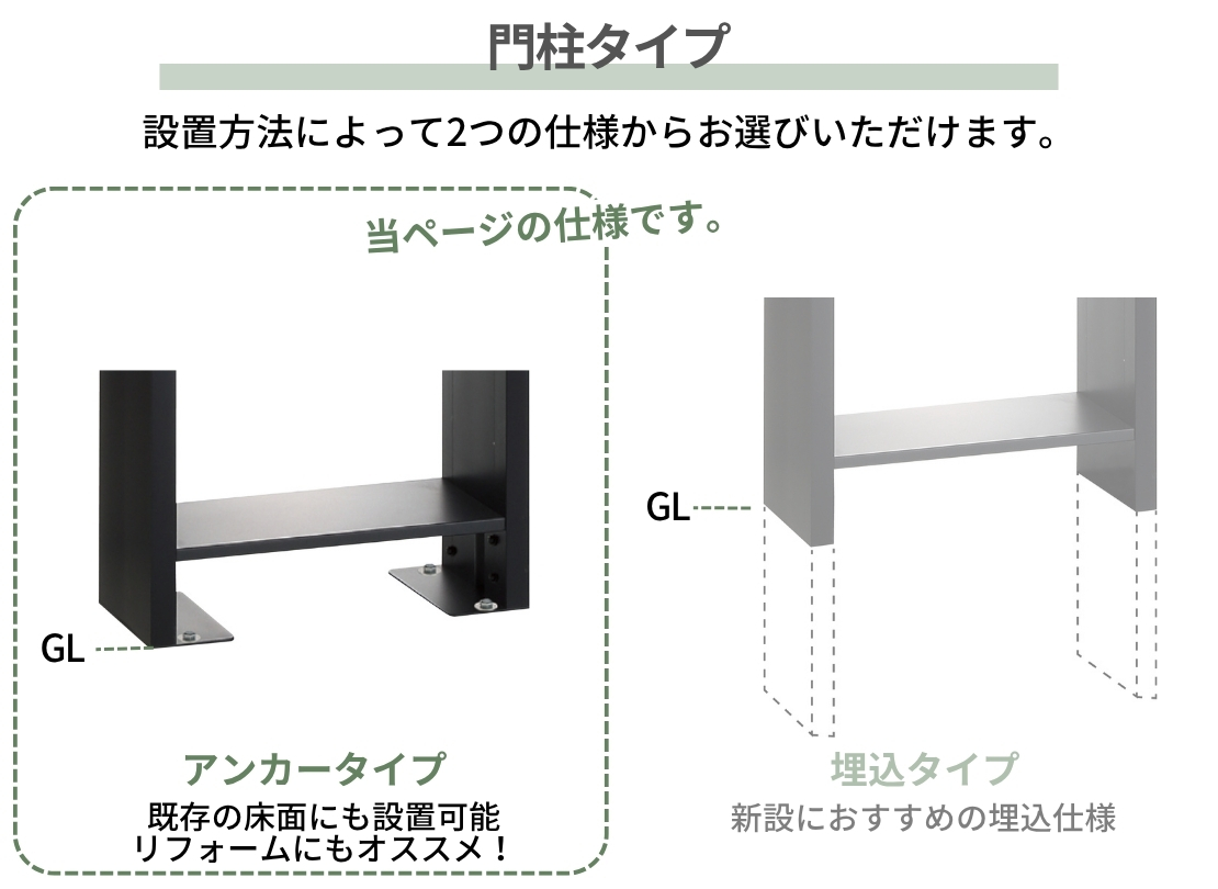 代替方法としては、埋め込みタイプのヴィコDBスタンドをご選定いただき、埋設時に左右のスペースに合わせて別途柱を施工する方法もございます。施工費用と本体価格の差を比較しながら、ご検討いただくことをおすすめいたします。