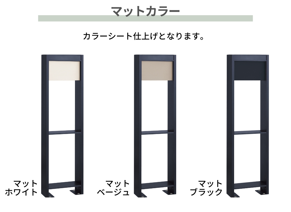 シンプルながらも上質感を演出できる「ヴィコDB専用の門柱スタンド」です。宅配ボックスや表札、インターホンをスマートに一体化できるので、玄関まわりをすっきりまとめたい方におすすめ。既存の床面にも設置できるアンカー仕様で、リフォームにも対応。カラーも豊富で、住まいの雰囲気に合わせて選べます。