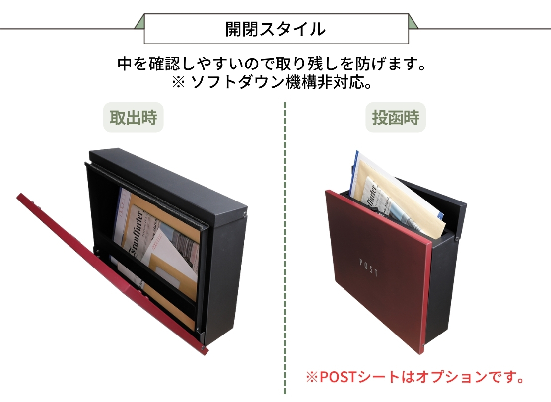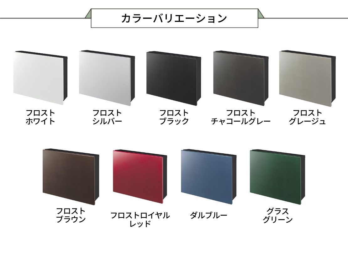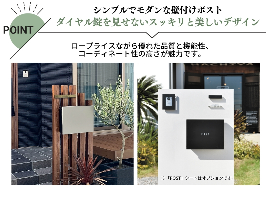 無駄を削ぎ落としたフラットデザインが魅力の壁掛けポスト「パーサス プレーン」。ダイヤル錠を正面から見せない設計で、玄関まわりをすっきりと見せたい方に向いています。カラーバリエーションも豊富で、外構テイストを選ばず合わせやすいのもポイント。シンプルさと価格バランスを重視したい方におすすめです。