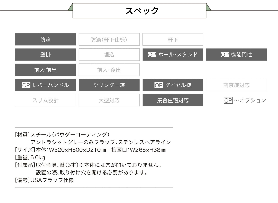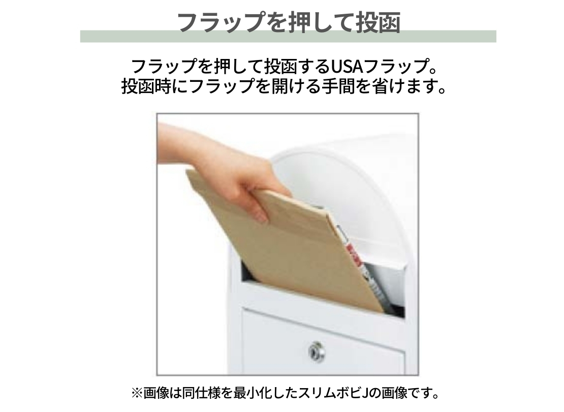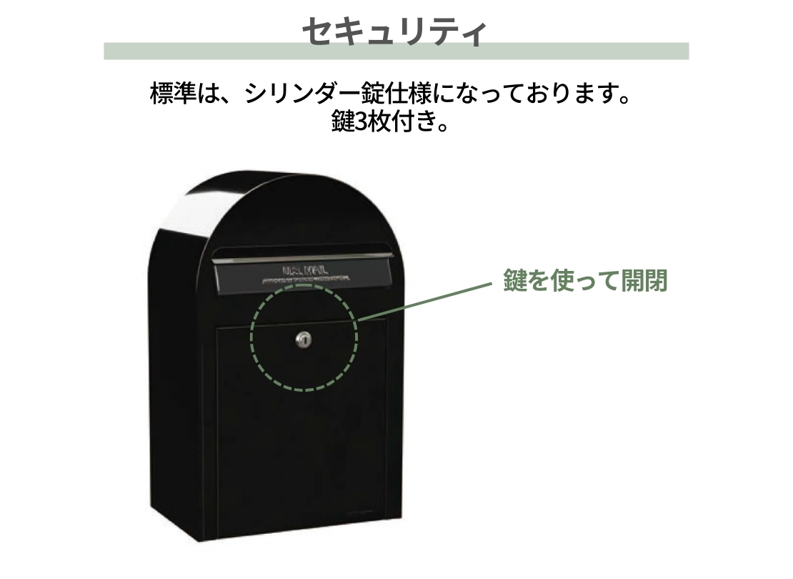 シンプルで丸みのあるフォルムが印象的なアメリカンデザインのポストです。USPS認可フラップを採用した押し込み式の投函口で、フラップを開ける手間なくスムーズに郵便物を投函できます。北欧デザインの外構やレンガ調の住宅とも相性がよく、別売のポールと組み合わせれば門まわりのアクセントとしてもおすすめです。