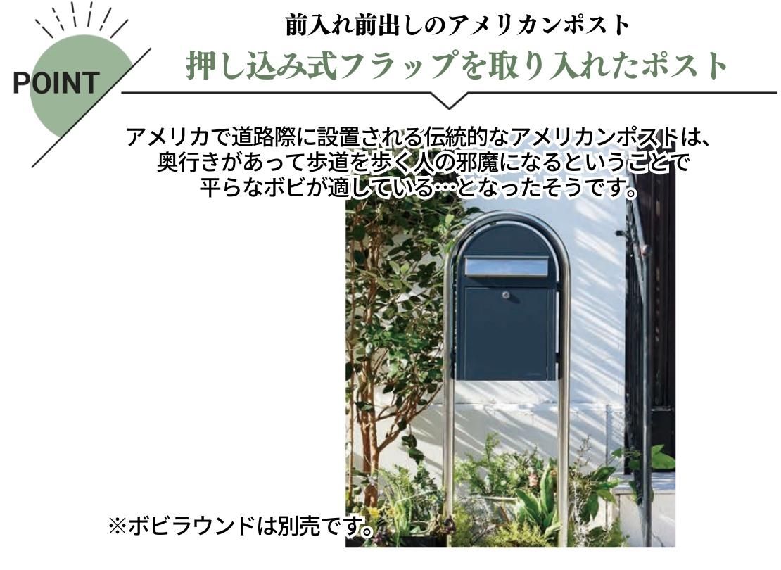 アメリカで道路際に設置される伝統的なアメリカンポストは、奥行きがあって歩道を歩く人の邪魔になるということで平らなボビが適している…となったそうです。