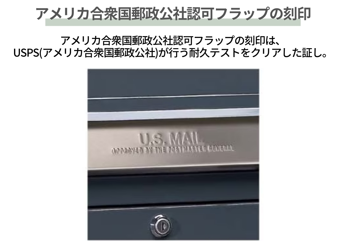 道路際の設置にはUSPS(アメリカ合衆国郵政公社)の承認が必要。押し込み式フラップに承認された郵便ポストだけが使用できる『U.S.MAILAPPROVED BY THE POSTMASTER GENERAL』のロゴがその証しです。
