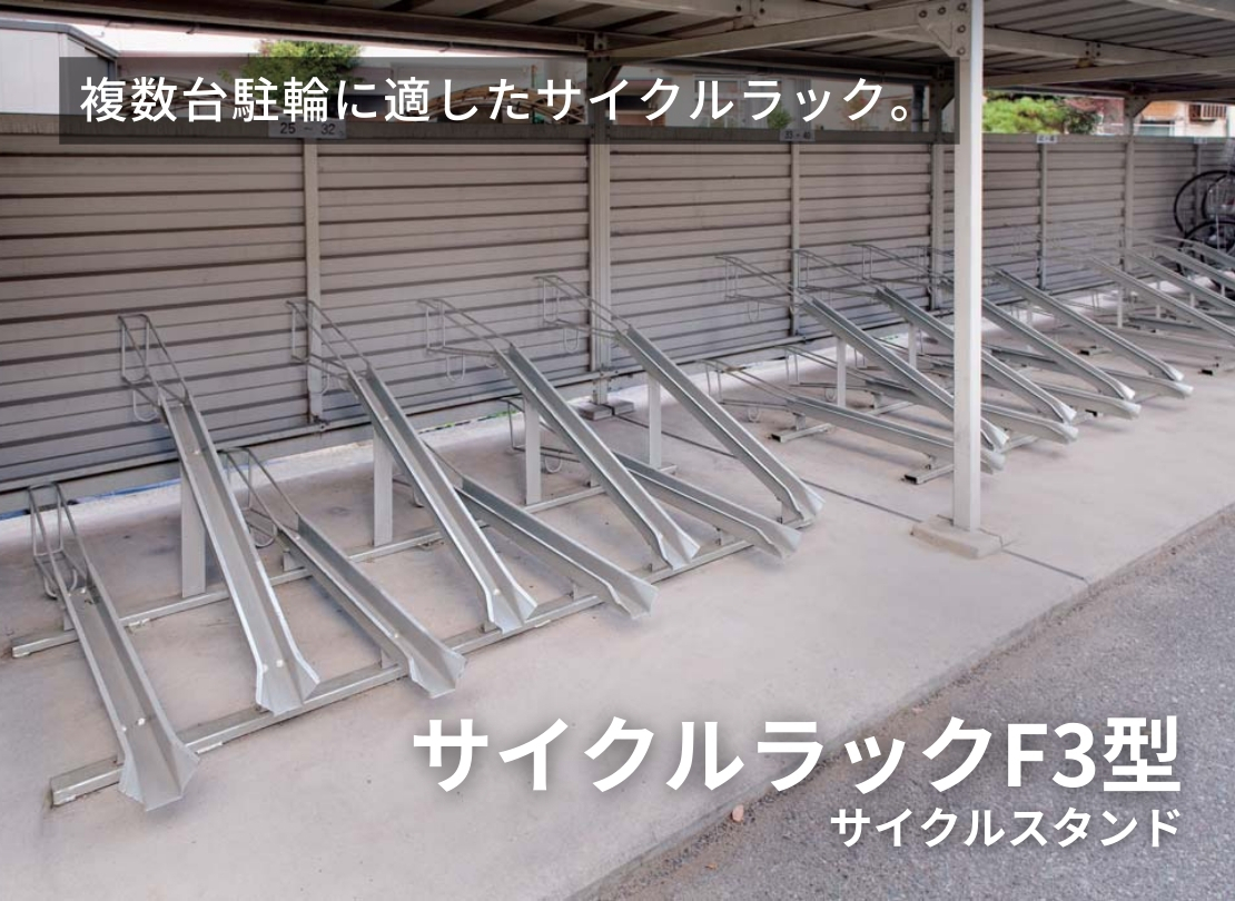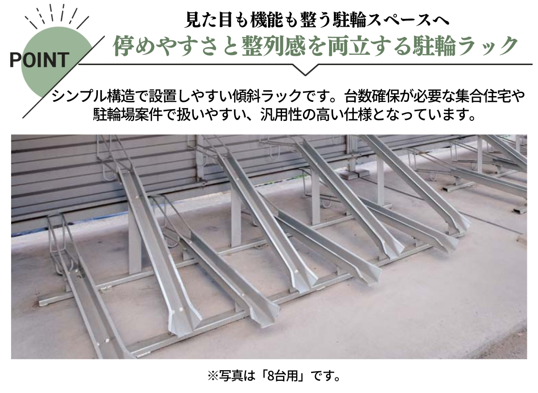 集合住宅で「台数をしっかり確保したい」という案件に使いやすいサイクルラックです。傾斜レールが前輪を自然に誘導してくれるため、入居者の方でも扱いやすいのが魅力。設置台数のバリエーションも豊富で、現場条件に合わせたレイアウト調整がしやすく、管理会社様・施工業者様にも採用いただきやすい仕様です。