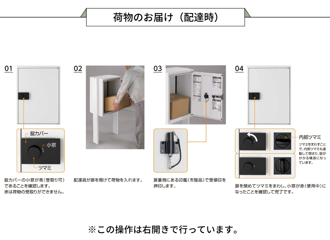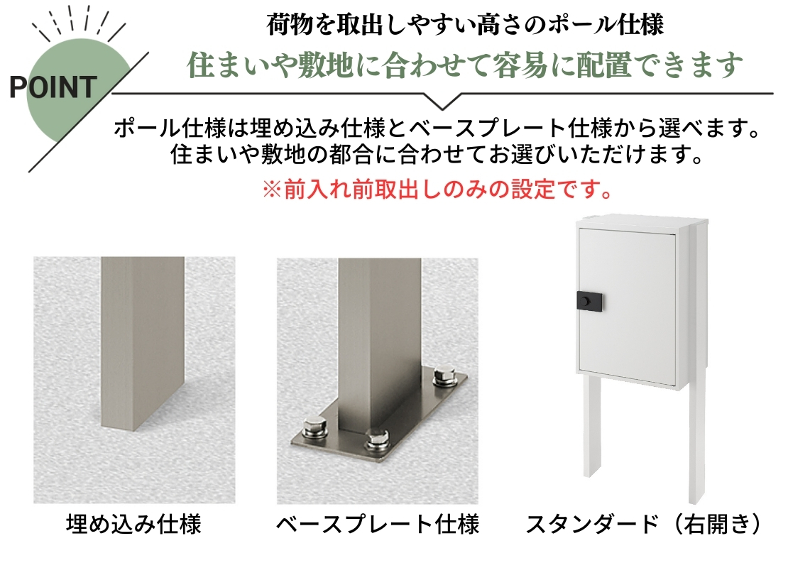 荷物を取出しやすい高さのポール仕様。住まいや敷地に合わせて容易に配置できます。