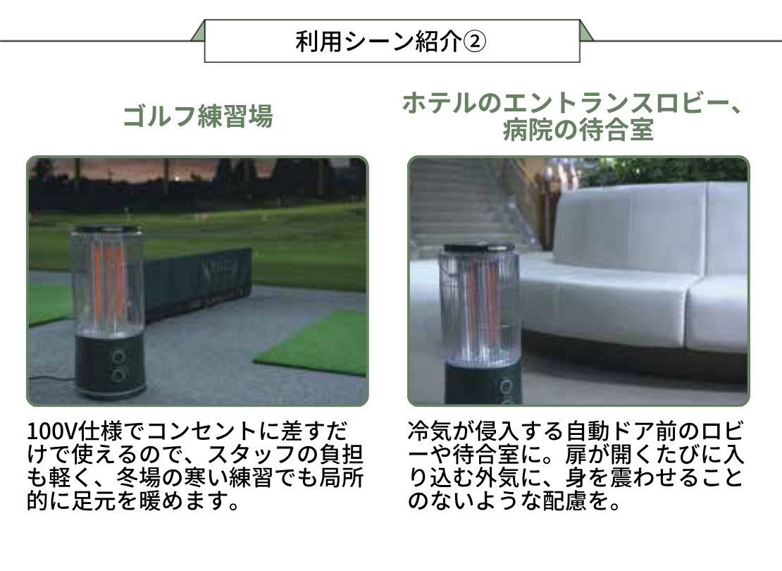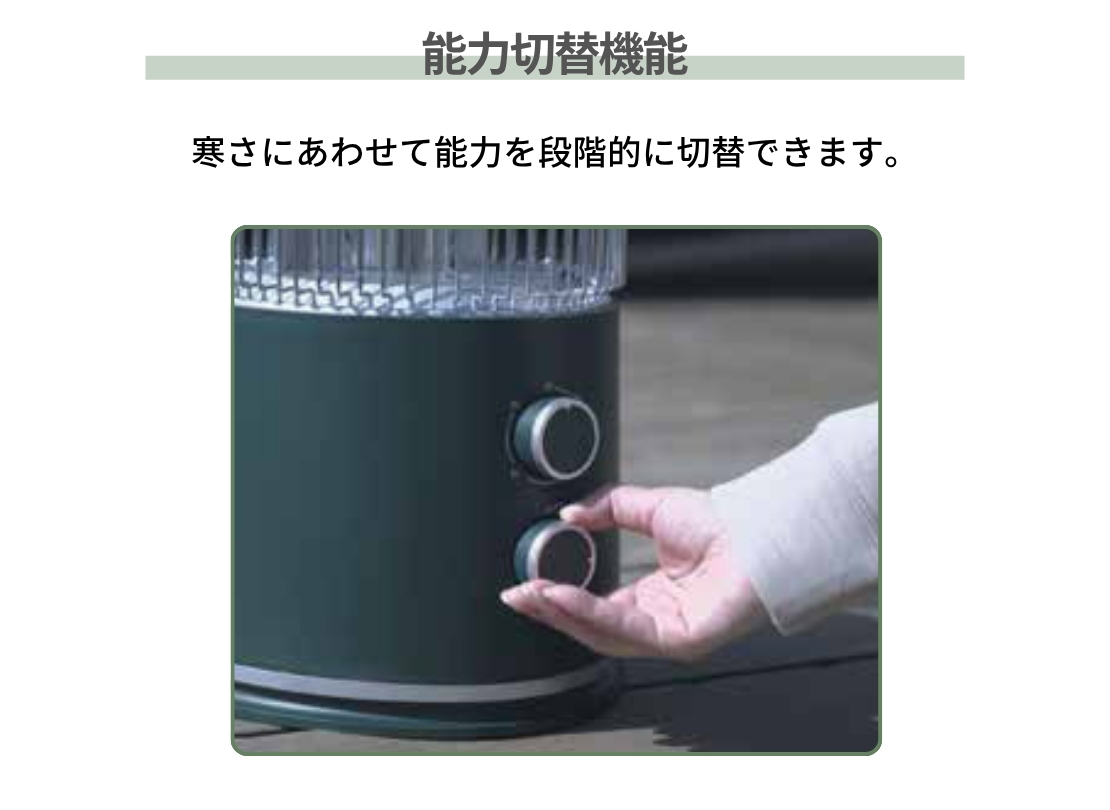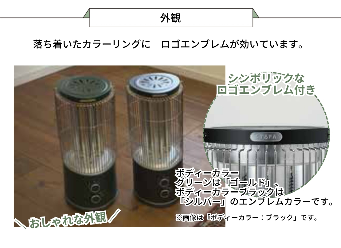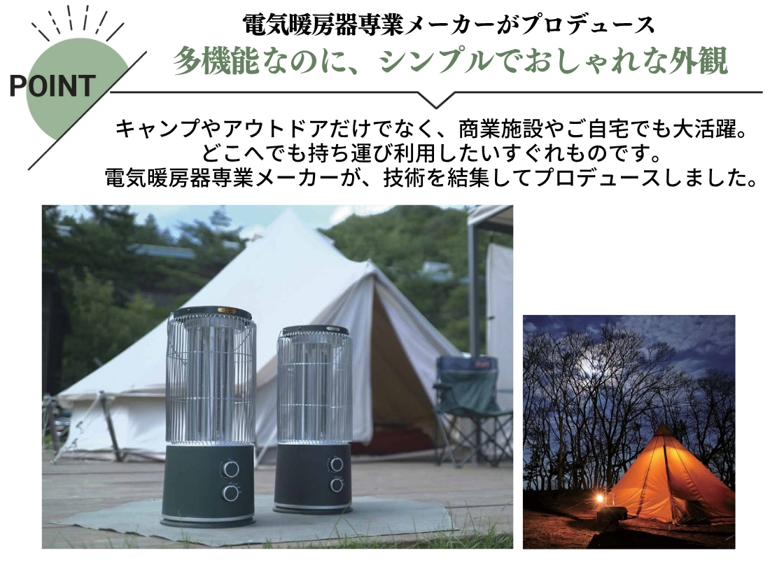 多機能なのに、シンプルでおしゃれな外観。どこへでも持ち運び利用したいすぐれものです。キャンプやアウトドアだけでなく、商業施設やご自宅でも大活躍。電気暖房器専業メーカー・インターセントラルが、技術を結集しプロデュースしました。