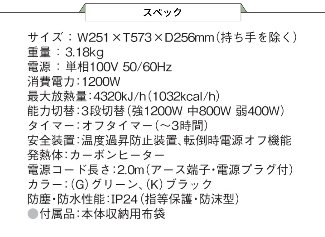 安全装置 | 温度過昇防止装置、転倒時電源オフ機能 |