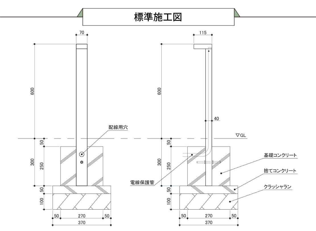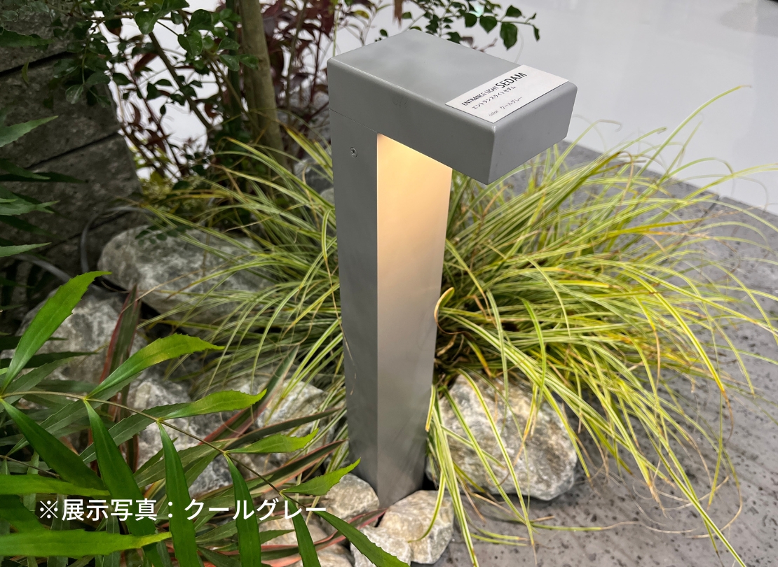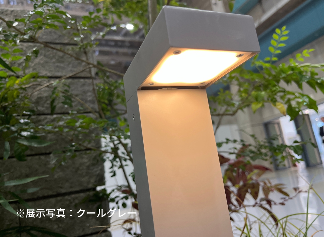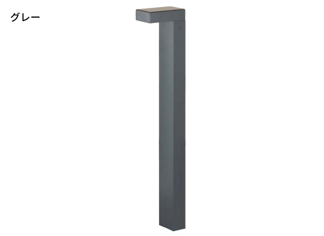 エントランスまわりをすっきり見せたい方におすすめの、直線基調でスマートなシルエットの照明柱です。アルミ製で軽量ながら質感もよく、植栽や門柱まわりに自然になじむデザインが魅力。電球色LEDの柔らかい光が足元を安全に照らし、夜のアプローチを美しく演出します。100V仕様のため、外構工事とあわせて設置しやすい点もポイントです。
