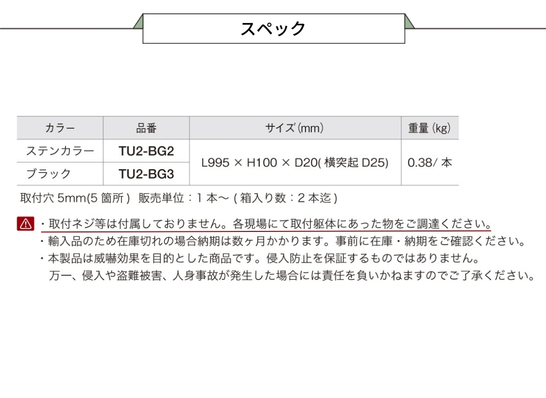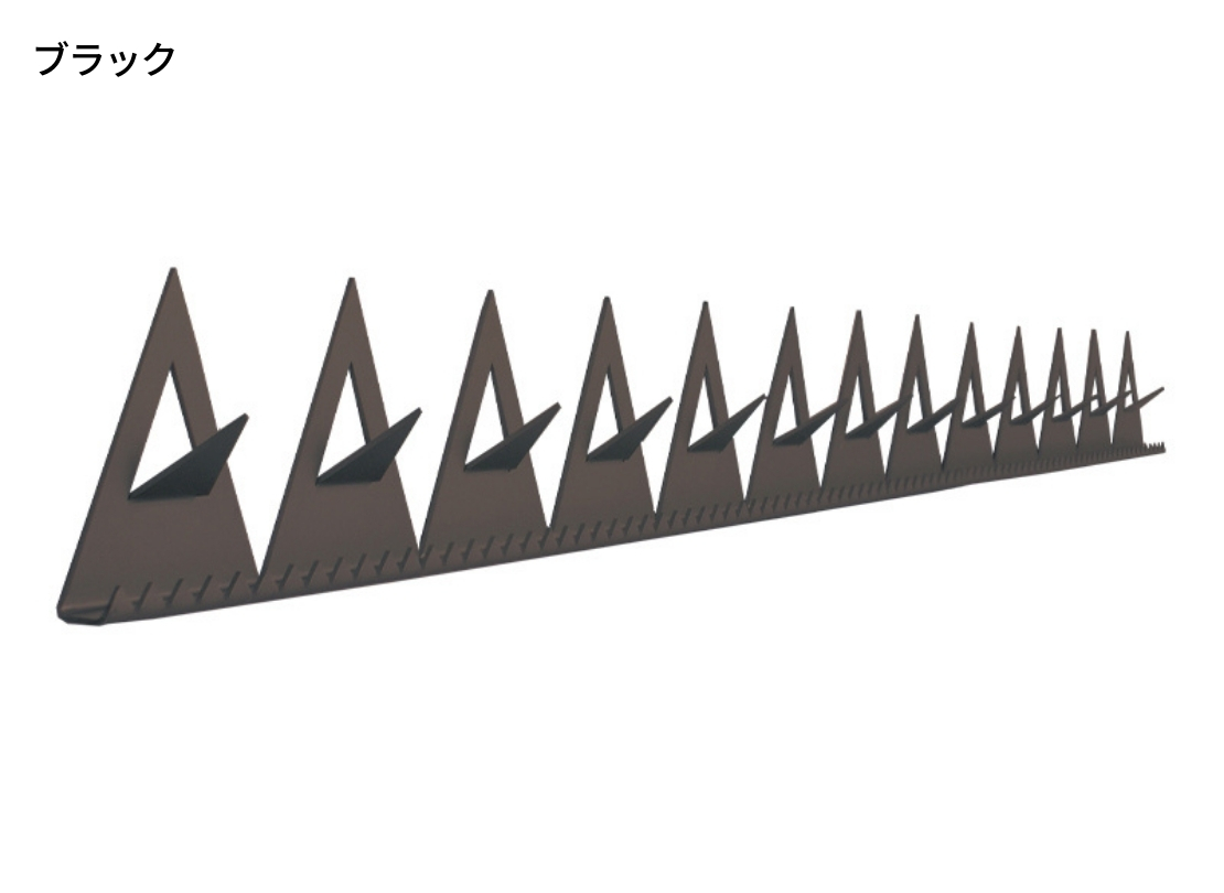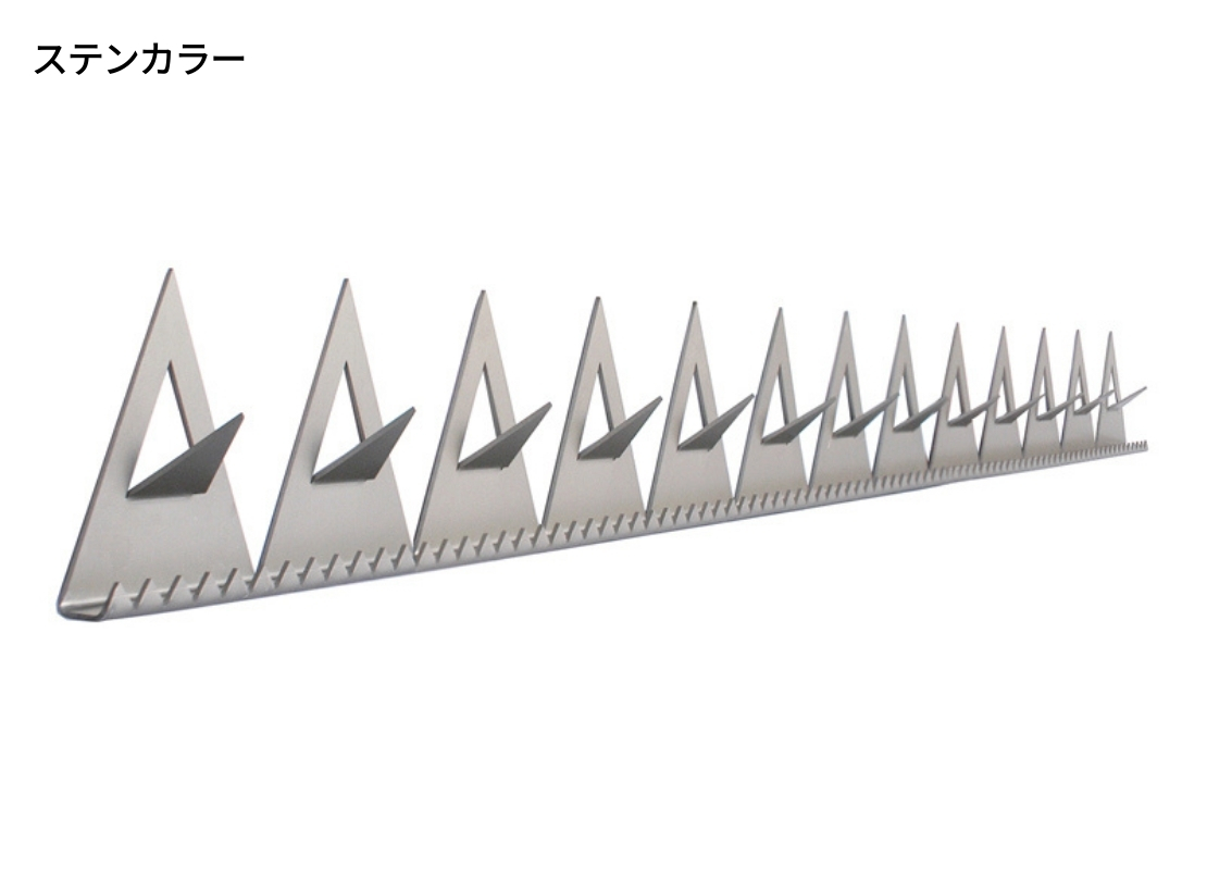 侵入を物理的に防ぐというより、近づきにくさを演出するタイプの忍び返しです。複数の鋭角突起と返し形状により、心理的な抑止力を重視した設計になっています。シンプルな意匠で外観を損ねにくく、モダン住宅や店舗の塀・庇上部にもなじみやすい点が特徴。現場での切断にも対応できるため、納まりを重視したい方におすすめです。