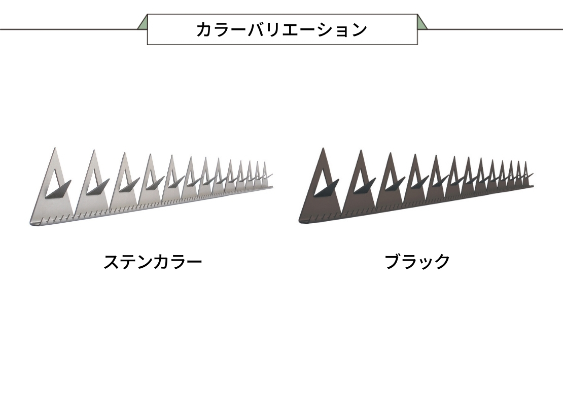 侵入者への抑止効果を高めるため、目的別に3種の突起を考案。シンプルで景観によく馴染みながらも、侵入者へ心理的威嚇を伝えるデザインです。また、立体的かつ細やかなピッチの突起で鳥除けとしての効果が期待できます。