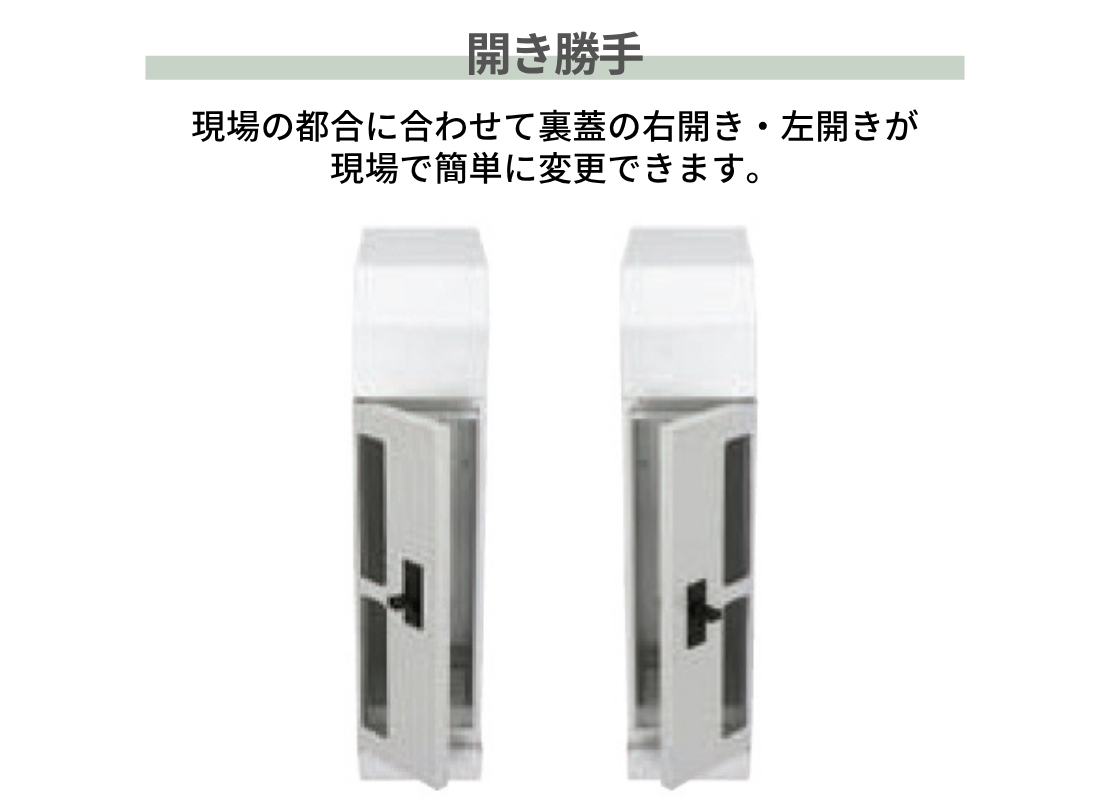 現場で右開き・左開きが変更できるので、手配時の取出し方向の心配をしなくて済む商品です。スリムな縦型のデザインで間口が広く取れない場所でもすっきりと収まります。