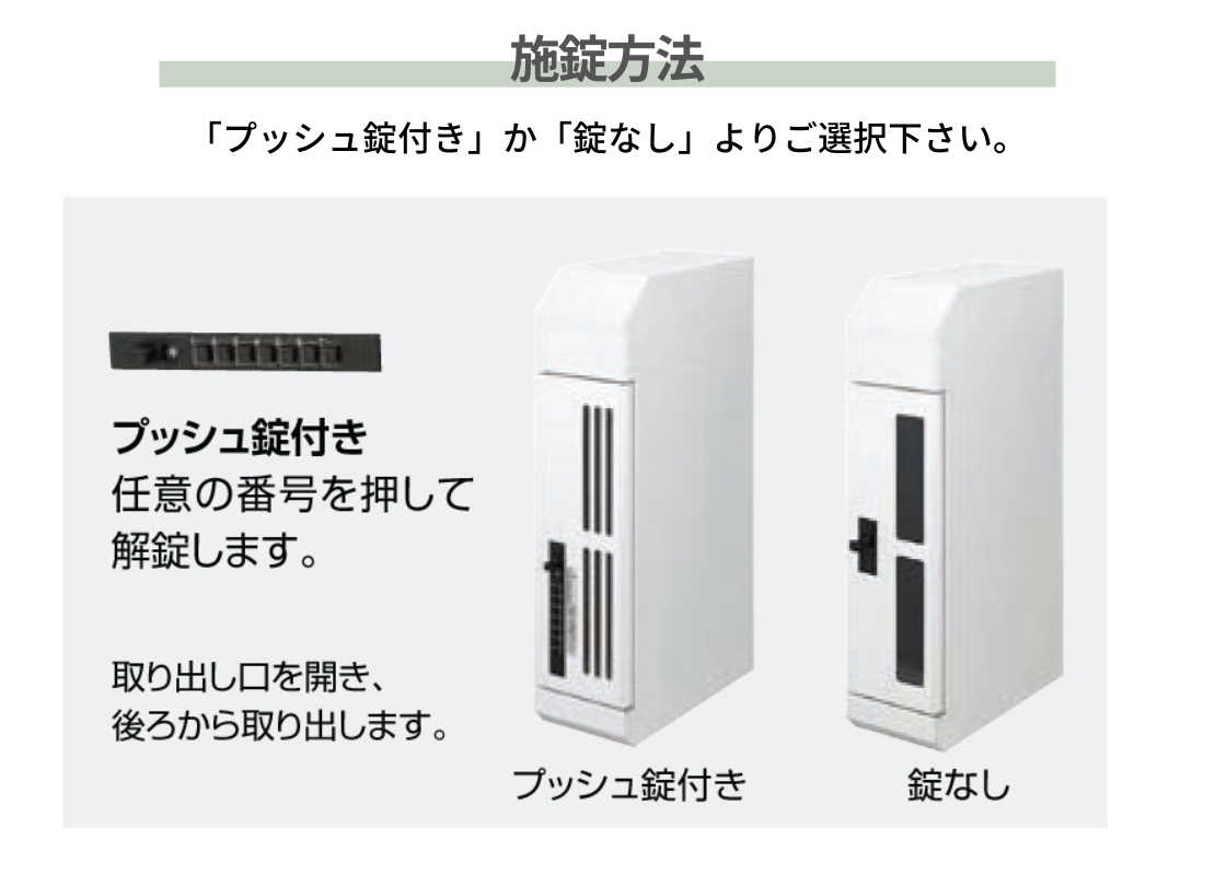 施錠方法 | 「プッシュ錠」か「錠なし」から選択 |