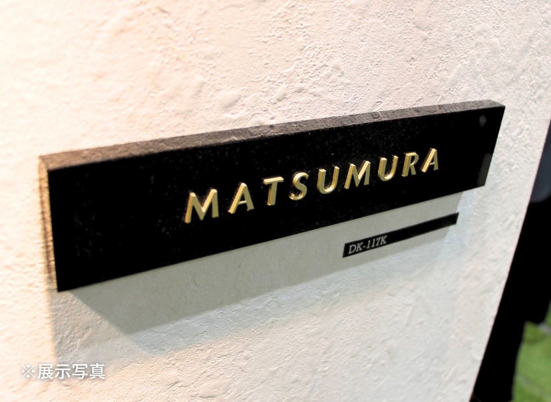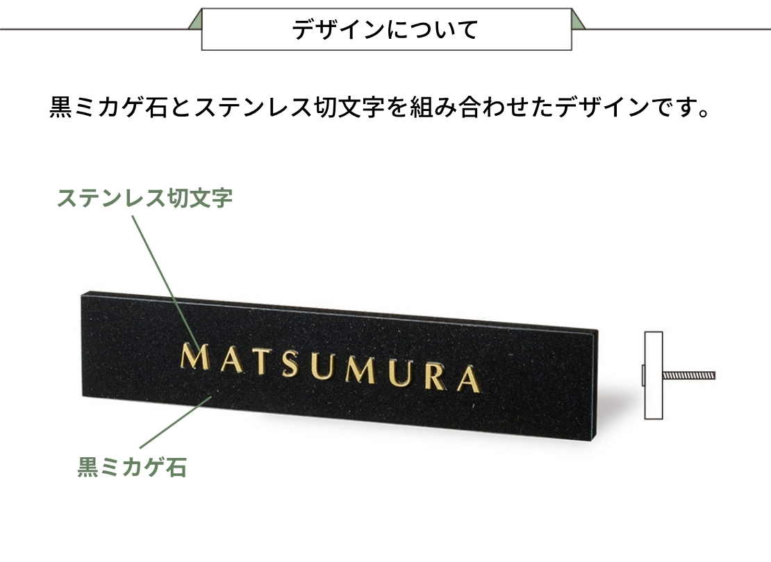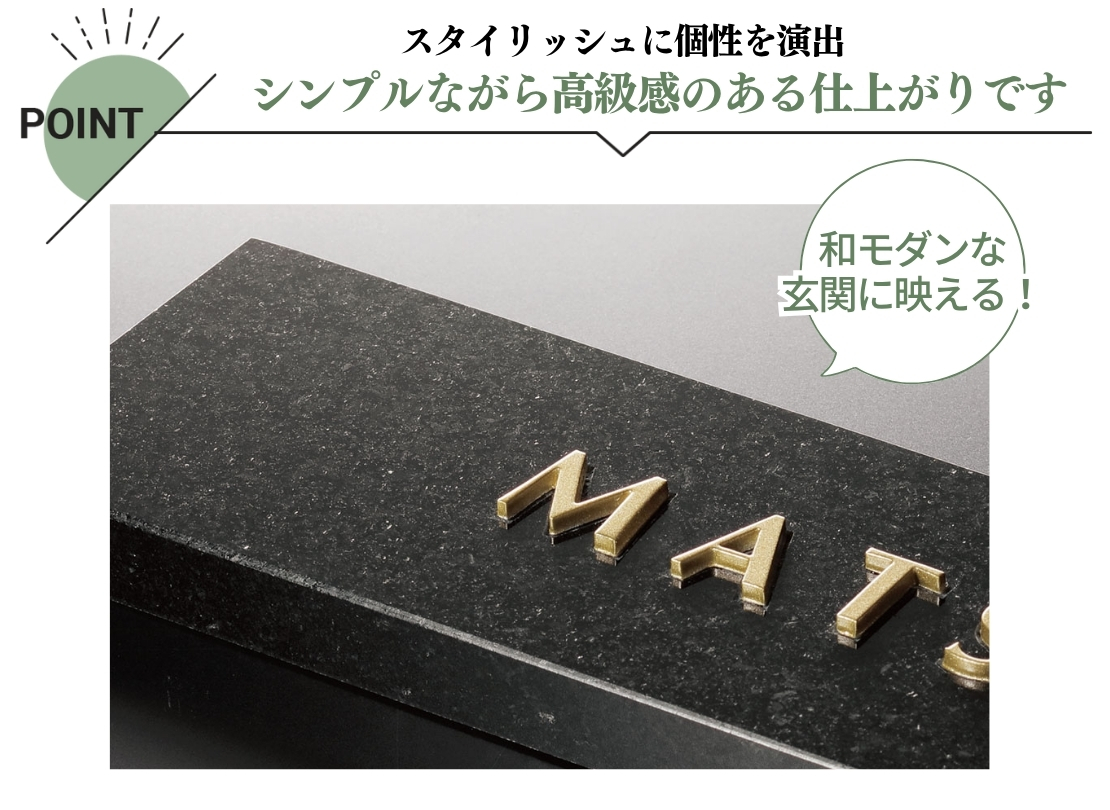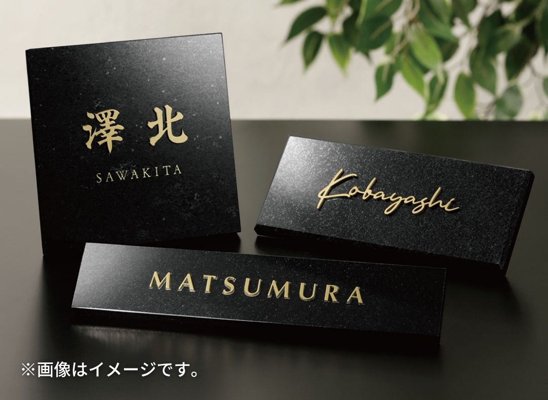 重厚感のある黒ミカゲ石に、サテンゴールド塗装のステンレス切文字を組み合わせた高級感のある表札です。和モダンやスタイリッシュな外構にも自然に調和し、玄関まわりを上品に引き締めます。金属文字の立体感が陰影を生み、夜間照明にも美しく映えるのが魅力です。