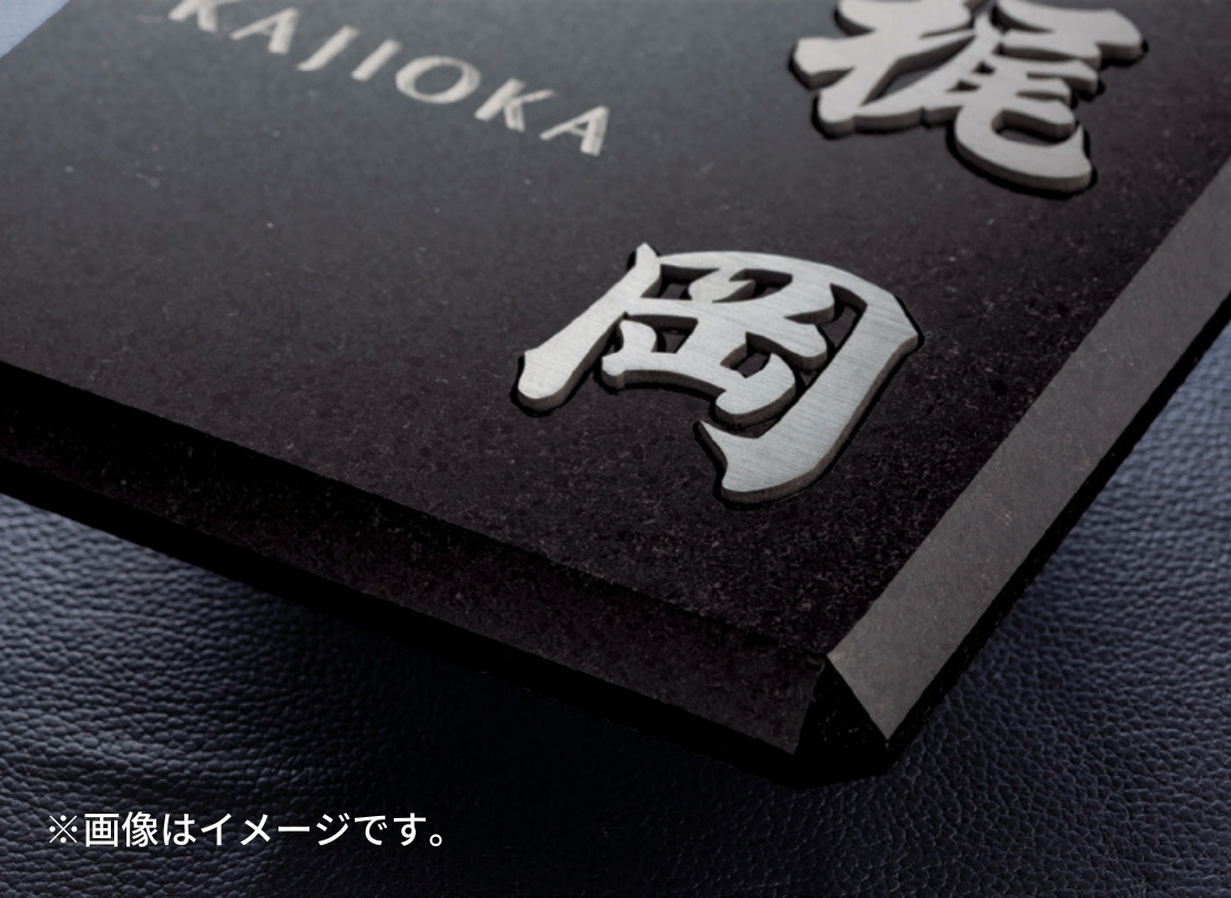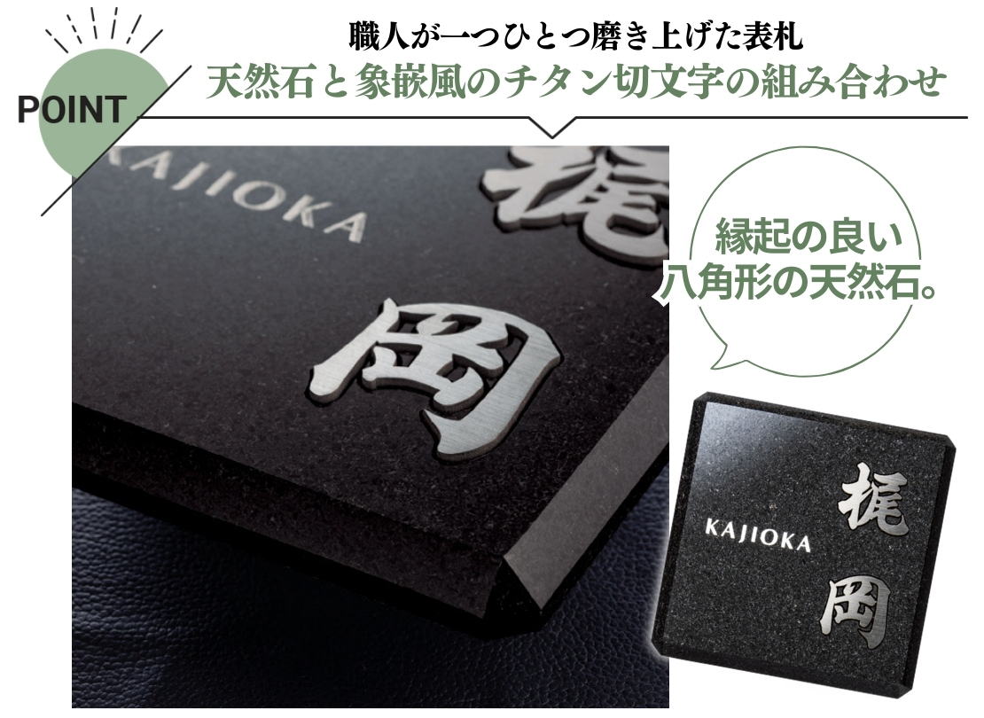 職人が一つひとつ磨き上げた、八角形の天然石と象嵌風のチタン切文字との組み合わせは、末永く我が家に幸運を呼び込みます。