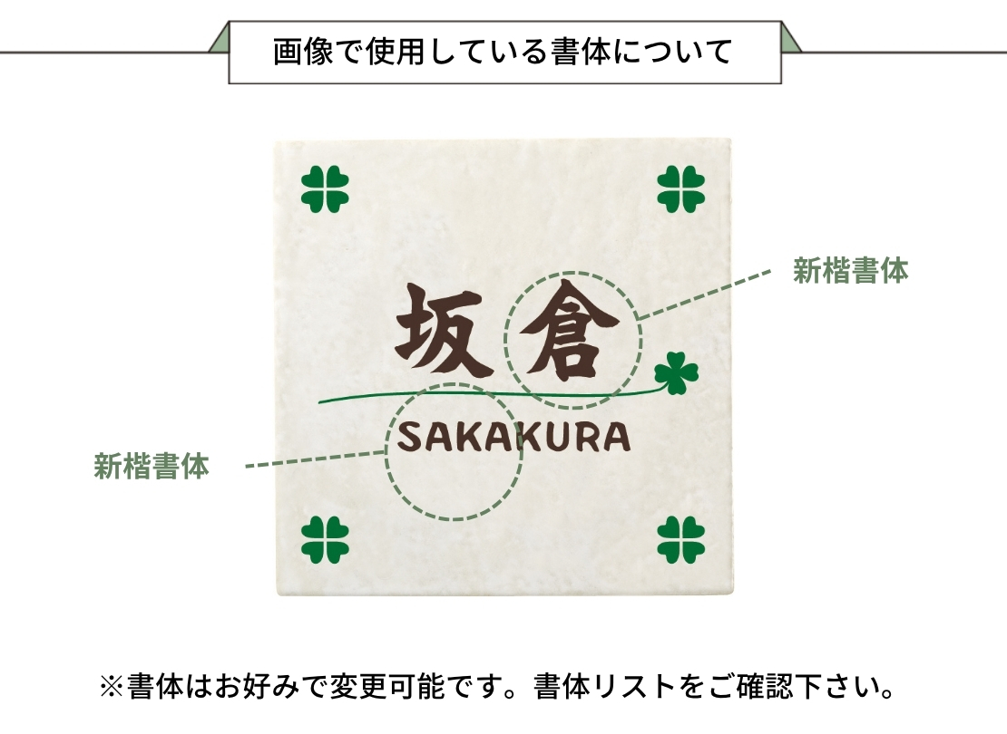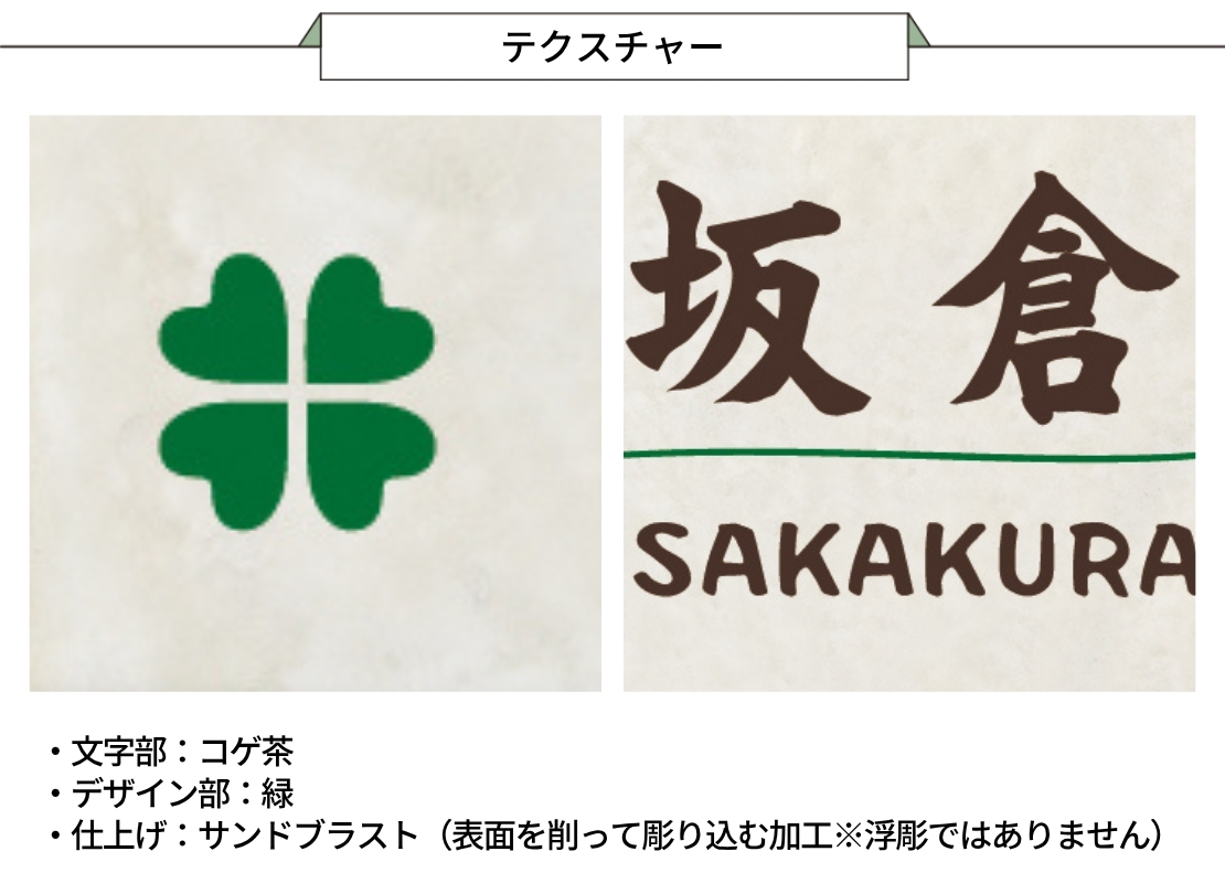 玄関まわりの印象づくりにこだわりたい方や、風水を意識した住まいづくりをされている方におすすめの表札です。四つ葉のクローバーが「希望・信仰・愛情・幸福」を象徴し、やさしい雰囲気を演出。コゲ茶の文字と緑のアクセントがナチュラルな外構に美しく調和します。