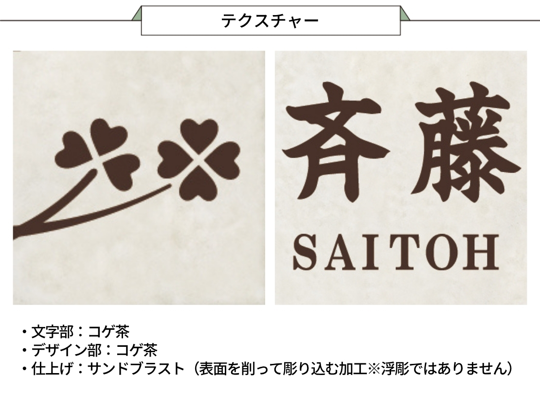 ナチュラルで落ち着いた玄関まわりにぴったりの表札です。四つ葉のクローバーをモチーフにしたやさしいデザインで、風水を気にされる方にも人気。文字とデザインを同色のコゲ茶でまとめ、統一感のある上品な印象に仕上がっています。シンプルながら温もりを感じる一枚です。