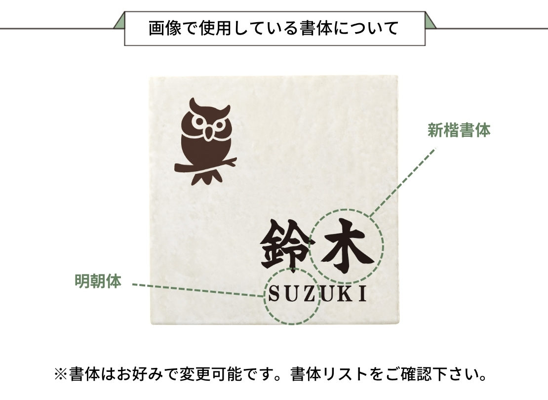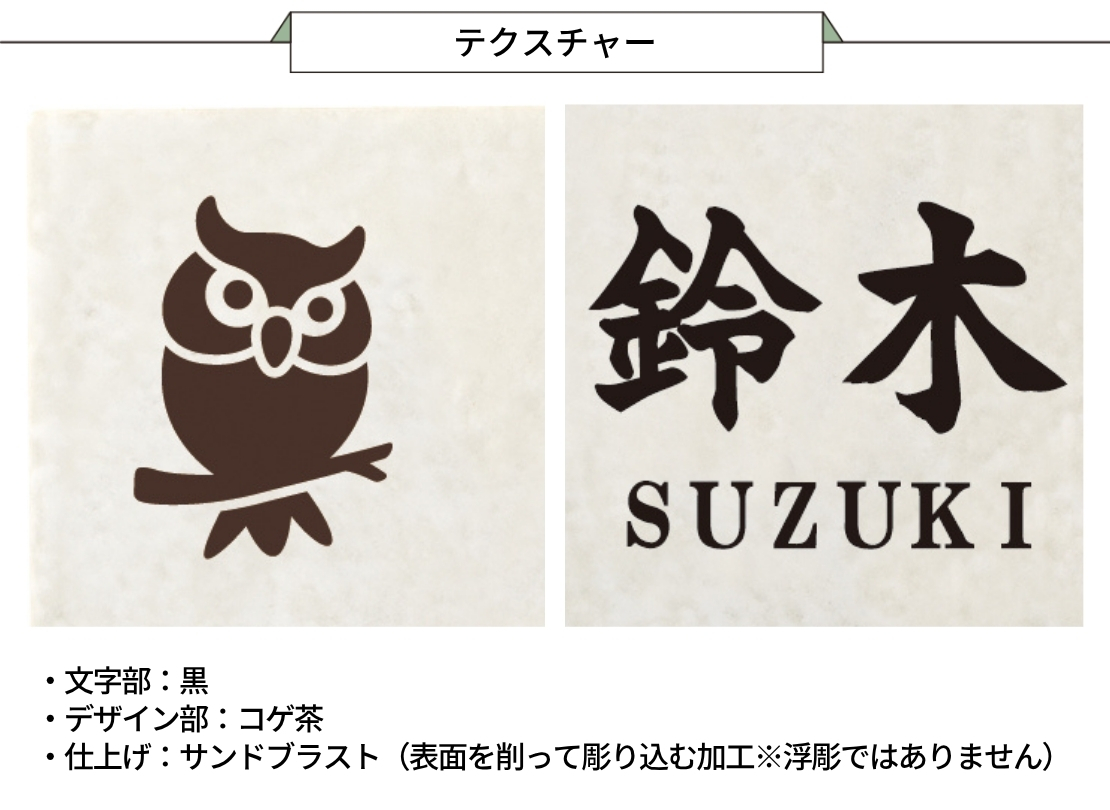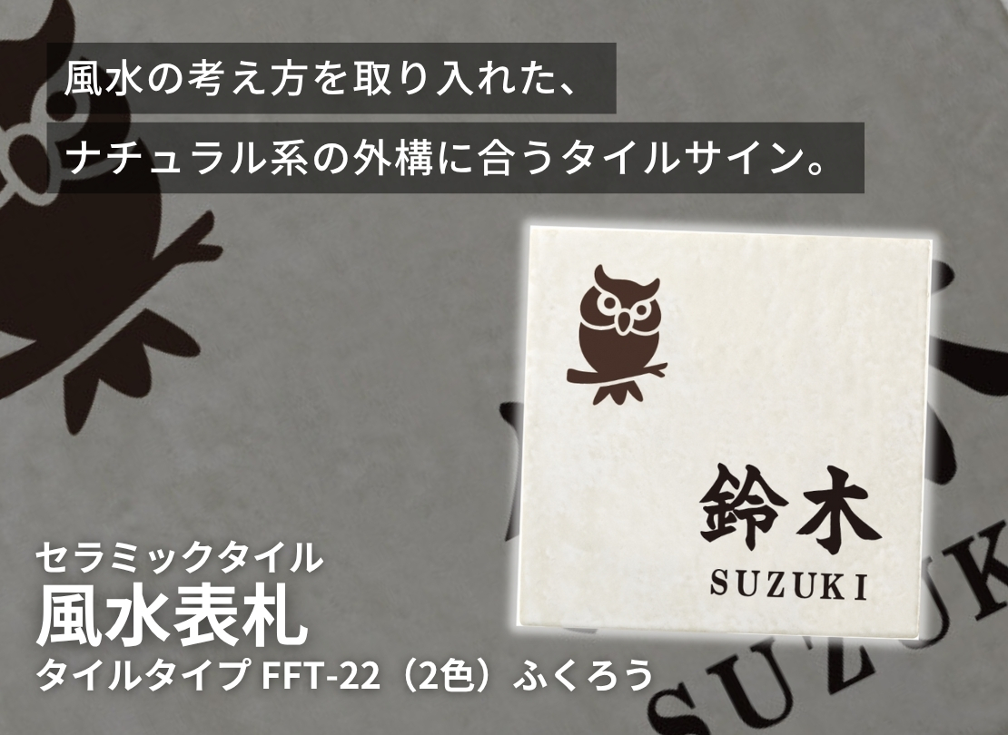 玄関まわりの印象づくりにこだわりたい方や、縁起の良いモチーフをさりげなく取り入れたい方におすすめの表札です。ふくろうは「不苦労」や「福来朗」ともいわれ、親しみのあるシンボルとして人気。落ち着いたコゲ茶のデザインがナチュラル系の外構にやさしくなじみます。