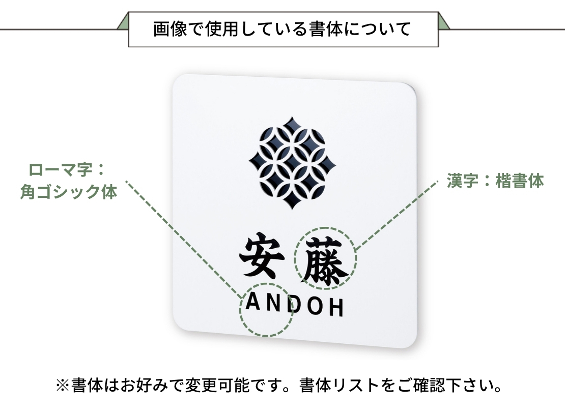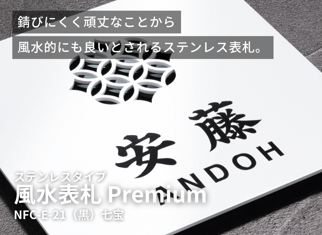 錆びにくく頑丈なことから風水的にも良いとされるステンレス表札。強い運気を吸い込めるよう、縁起柄部分には抜き加工を施しています。