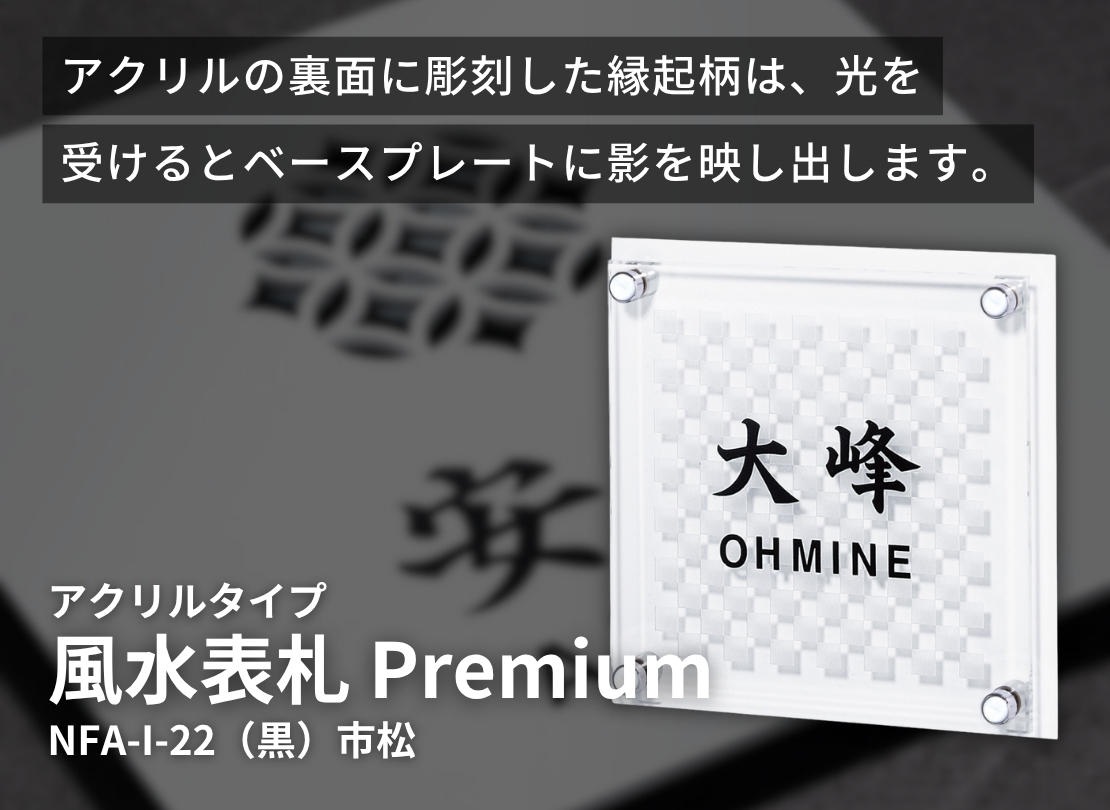 アクリルの裏面に彫刻した縁起柄は、光を受けるとベースプレートに影を映し出します。二重に見える縁起柄がさらなる運気を呼び込むかもしれません。