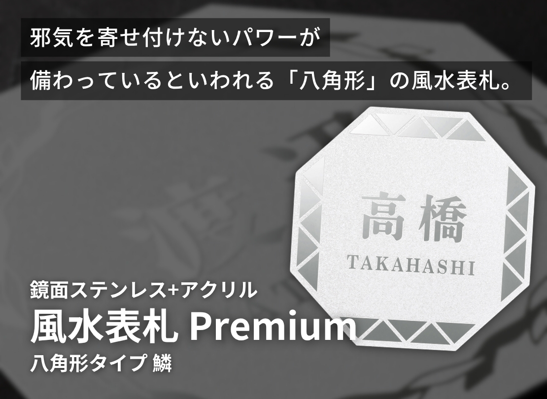 邪気を寄せ付けないパワーが備わっているといわれる「八角形」の形状に加え、悪い気を跳ね返すといわれる「鏡面」のステンレスを採用。お家の運気を守る風水表札です。