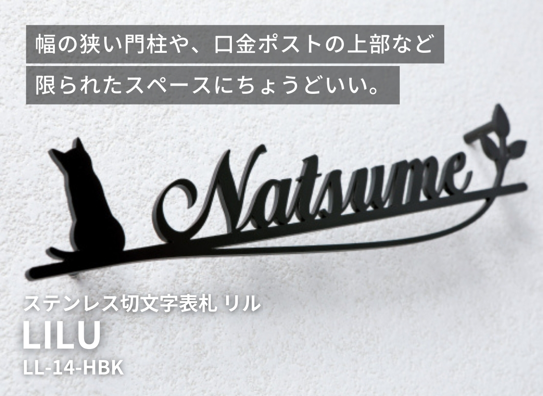 猫好きのご家庭や、柔らかい雰囲気の玄関まわりをつくりたい方にぴったり。ちょこんと座る猫のシルエットと、流れるような筆記体が上品に調和し、外構にやさしいアクセントを添えてくれます。幅約290mmのスリム設計なので、門柱や口金ポスト上など限られたスペースにも取り付けやすく、住まいをさりげなく個性的に演出できます。