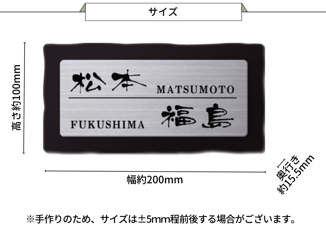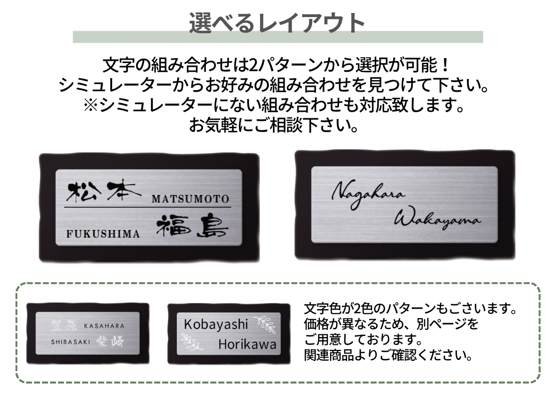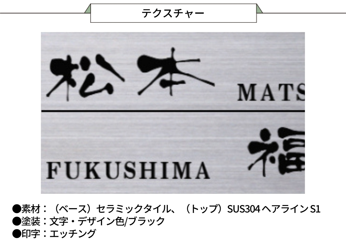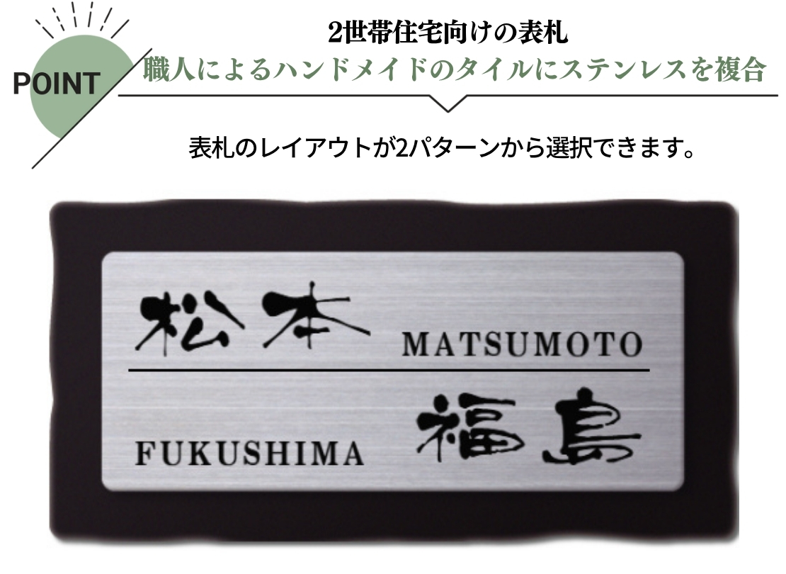職人が手作業で仕上げたタイルにステンレスを組み合わせた、あたたかみと上質感を両立した表札です。2世帯仕様のレイアウトが選べるので、名字の組み合わせもしっかり整理して見やすく表示できます。ナチュラル外構やシンプル住宅に合わせたい方に特におすすめです。