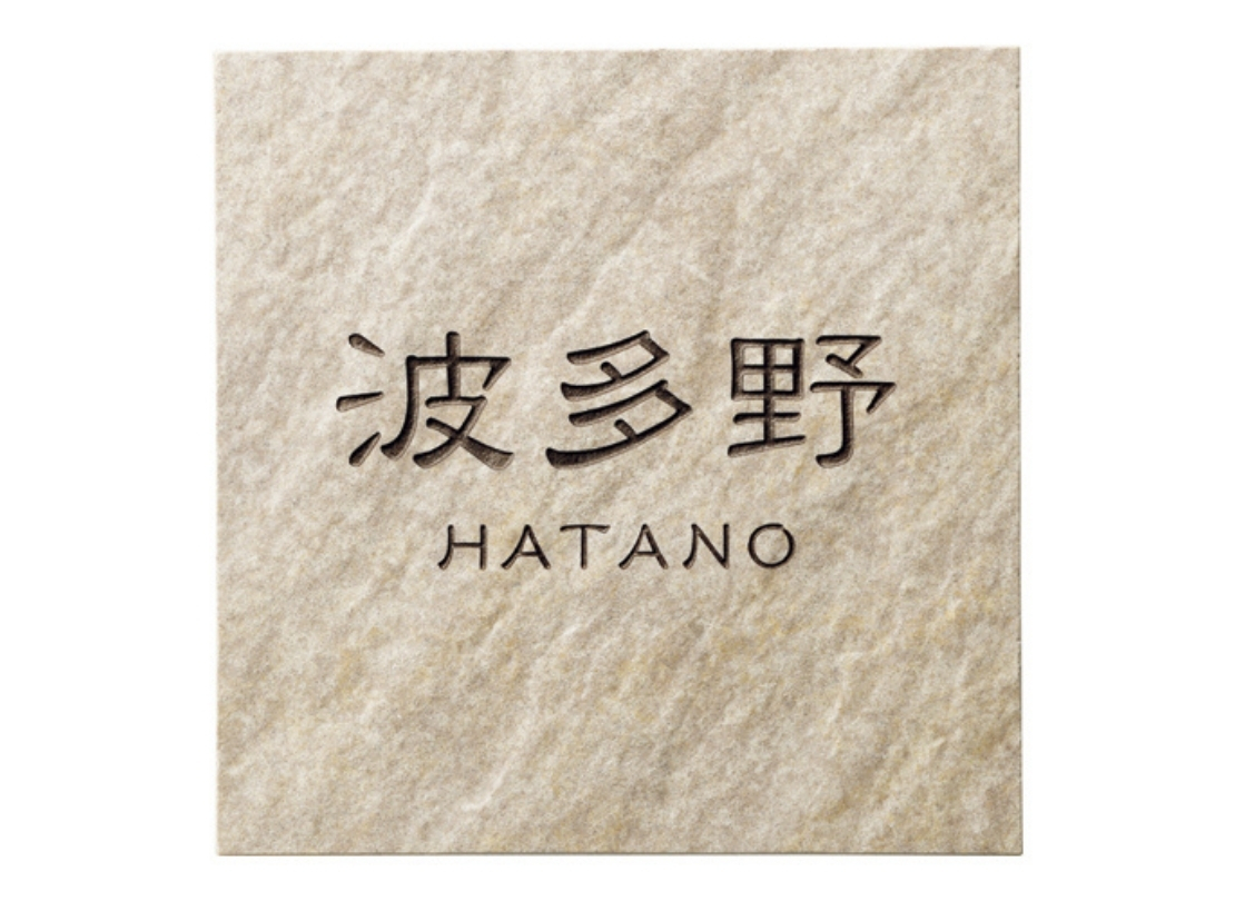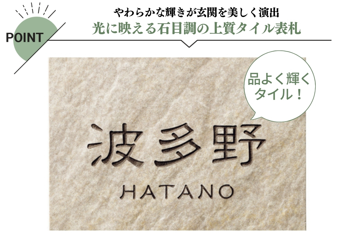 落ち着いた玄関まわりを演出したい方におすすめのタイル表札です。光が当たると石目調タイルがやわらかく輝き、住まいに上質なアクセントを添えてくれます。彫込文字には深みのあるパールブラウン塗装を採用しており、読みやすさと高級感の両立が魅力。シンプルだけど雰囲気のある表札を探している方にぴったりです。