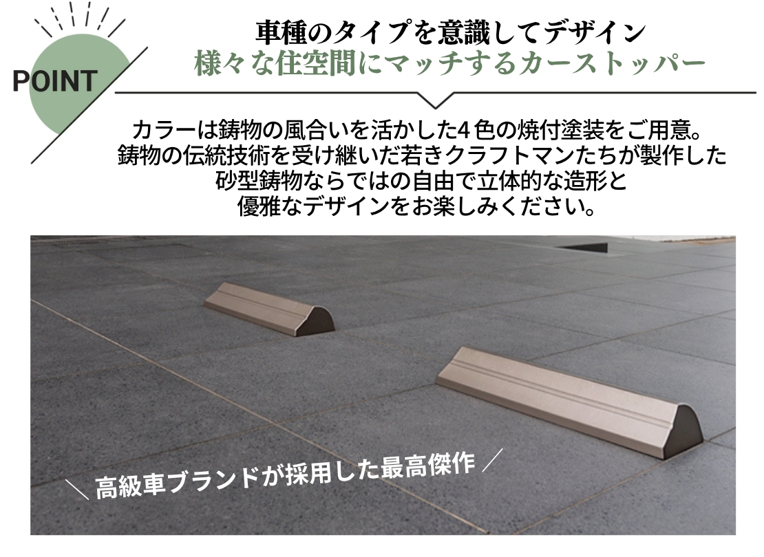 車種のタイプを意識してデザインされた、様々な住空間にマッチするアルミ鋳物製のカーストッパー、C600シリーズ。