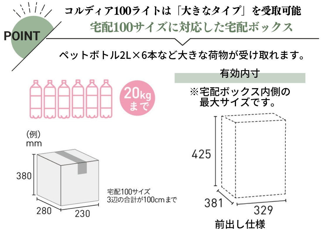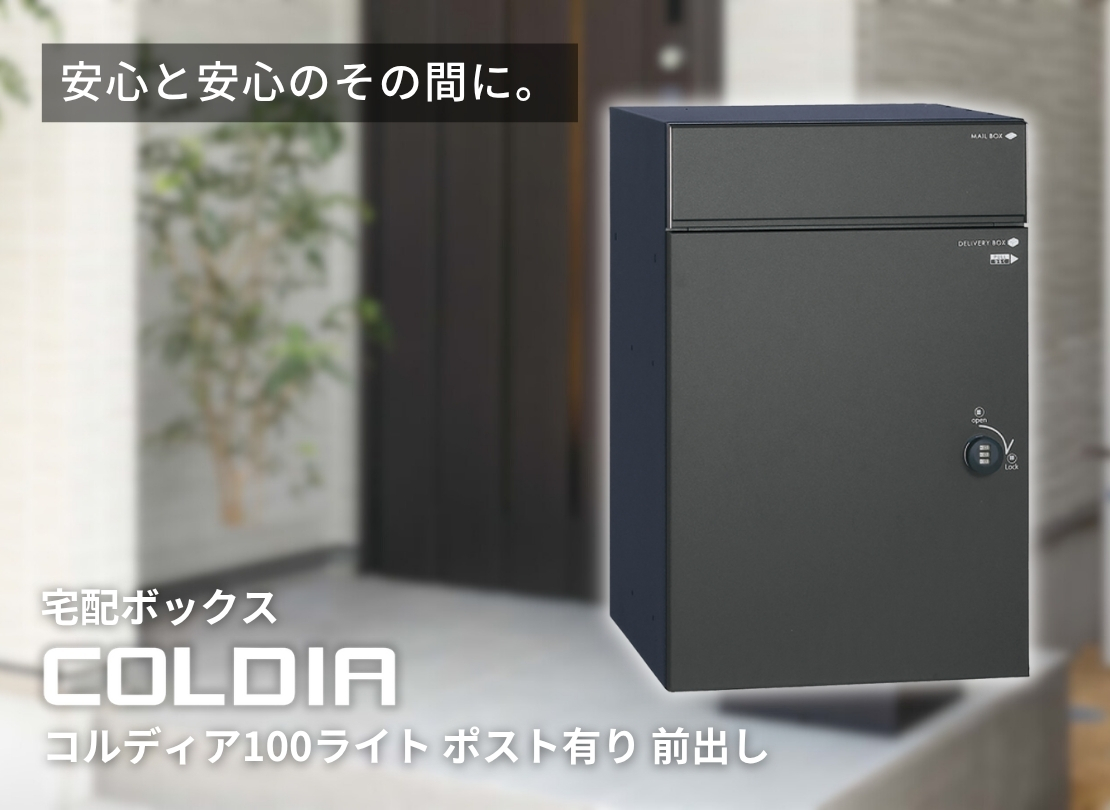 「コルディア100ライト 前出しタイプ」は、正面から郵便物と荷物をそれぞれ取り出せるポスト一体型宅配ボックスです。宅配100サイズ(20kgまで)の荷物に対応し、ネット通販などの大きめな荷物も安心して受け取れます。スッキリとしたマットカラーで外構にもなじみやすく、玄関まわりを上品にまとめたい方におすすめです。