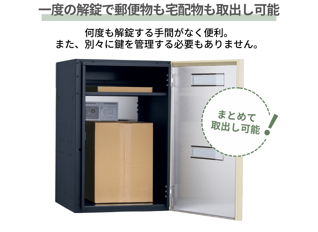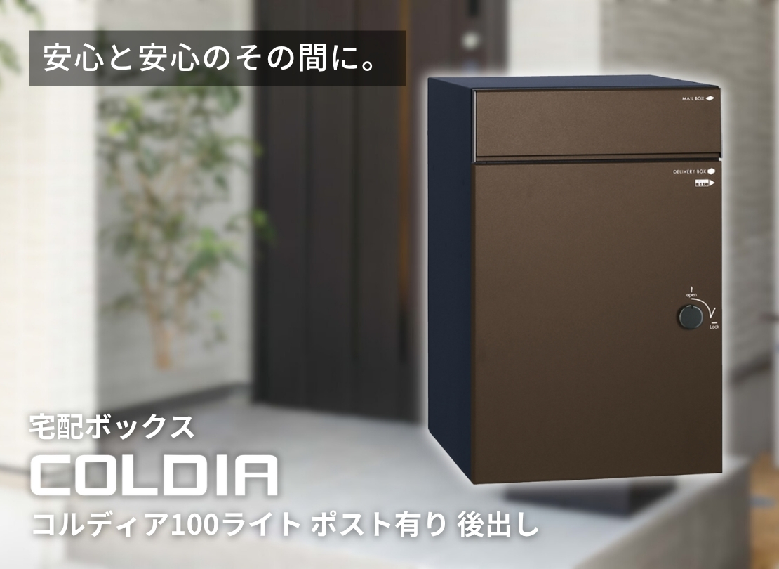 戸建て住宅にぴったりな「コルディア100ライト」は、ポストと宅配ボックスを一体化した後出しタイプ。宅配100サイズ(2Lペットボトル6本相当)まで受け取れる大容量で、不在時も安心です。郵便物と宅配便を一度の解錠でまとめて取り出せるのも便利。カラーは外構になじむ落ち着いた4色展開です。
