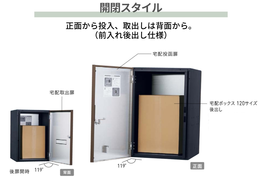宅配120サイズ(お米20kgやペットフード袋など)に対応した、大容量の宅配ボックスです。荷物の受け取りは前面から投函・背面から取り出す「後出し仕様」で、住宅側からスムーズに荷物を取り出せます。シンプルなデザインと4色展開で、どんな外構にも馴染みやすいのも魅力です。