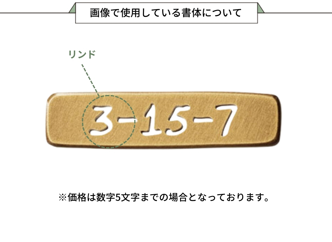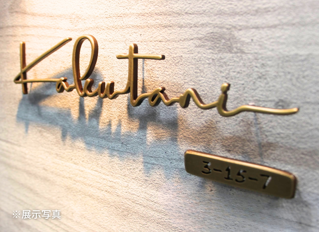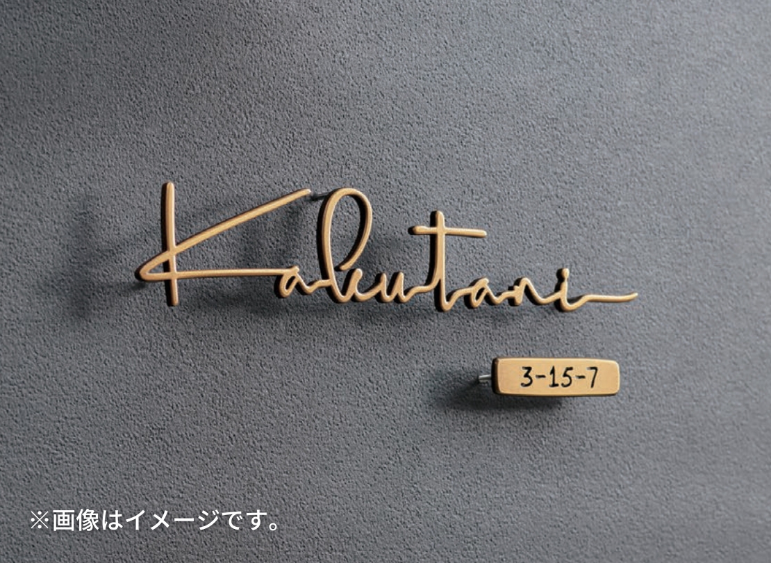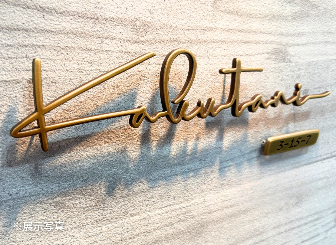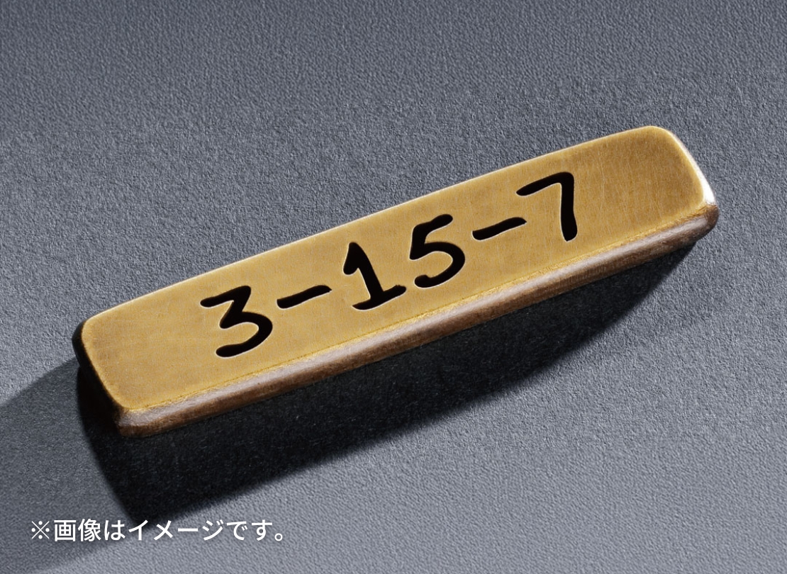 真鍮ならではの落ち着いた色味と、切り抜き文字の陰影が印象的な番地オプションです。表札と素材感を揃えたい方や、玄関まわりをさりげなく格上げしたい場合に相性が良く、ラシック切文字と組み合わせることで統一感のある外観に仕上がります。主張しすぎないサイズ感なので、デザイン表札の引き立て役としてもおすすめです。