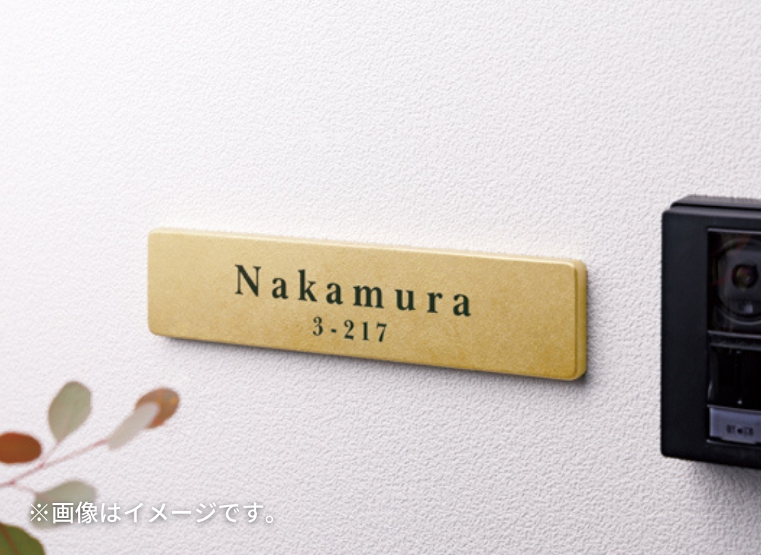 真鍮風のエイジング塗装がおしゃれな表札です。塗装なのでゴールド色の経年変化も起きにくいのもポイント。