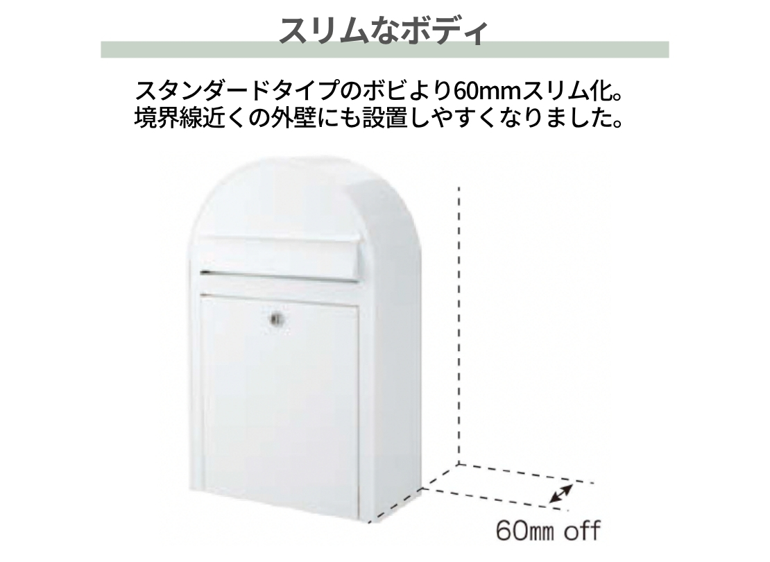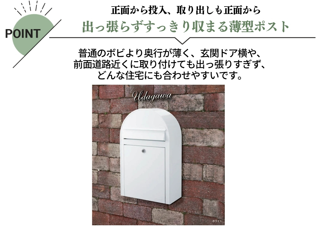 普通のボビより奥行が薄く、玄関ドア横や、前面道路近くに取り付けても出っ張りすぎず、どんな住宅にも合わせやすいです。