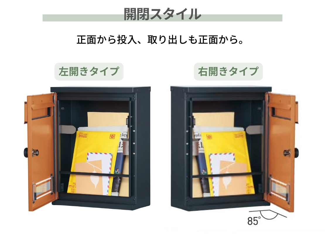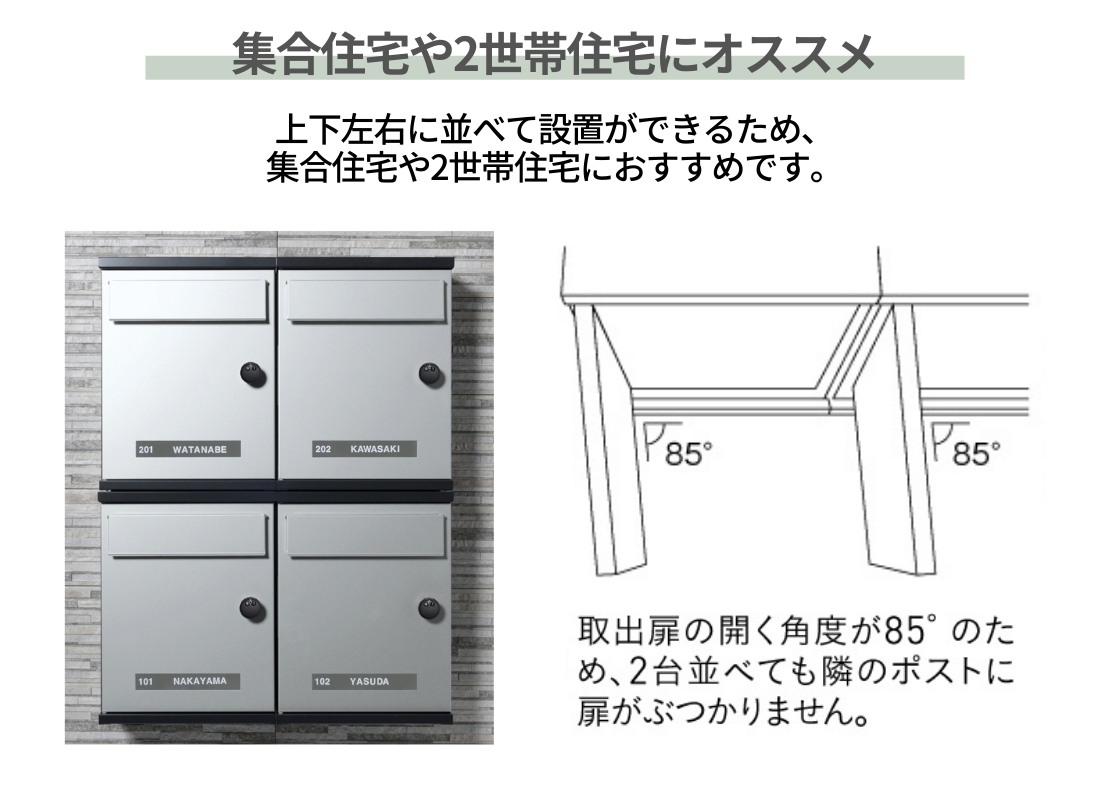 集合住宅や二世帯住宅で「横にぴったり並べたい」方に便利な壁付けポストです。扉の開閉角度が85°なので隣同士でも干渉しにくく、複数台設置がスムーズ。透明窓で郵便物の有無もひと目で確認でき、名前シールも同梱。ダイヤル錠でセキュリティにも配慮した扱いやすいモデルです。