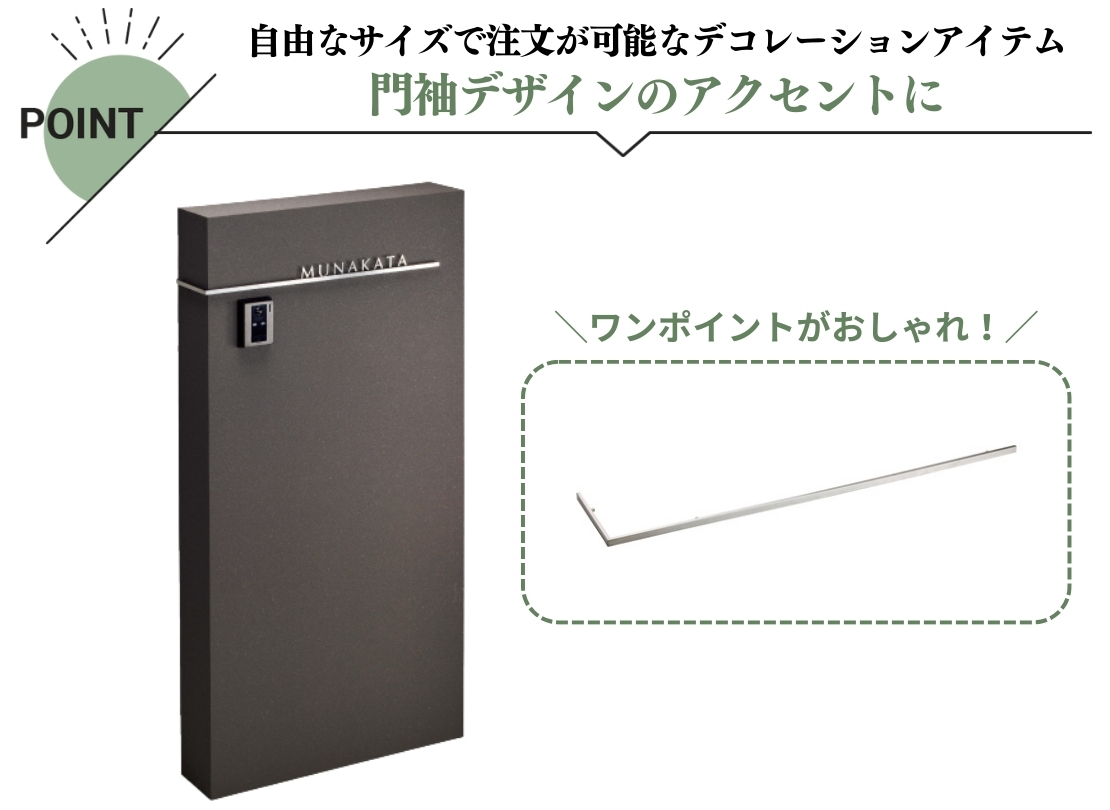 門まわりを手軽にセンスアップしたい方におすすめ。サイズオーダーOKで、門袖に対してL型ラインがさりげなく映えます。カラーも選べて、お家の雰囲気にぴったり合わせられます。