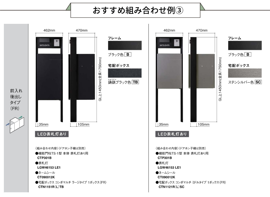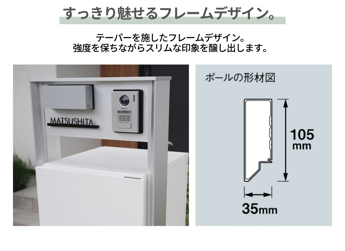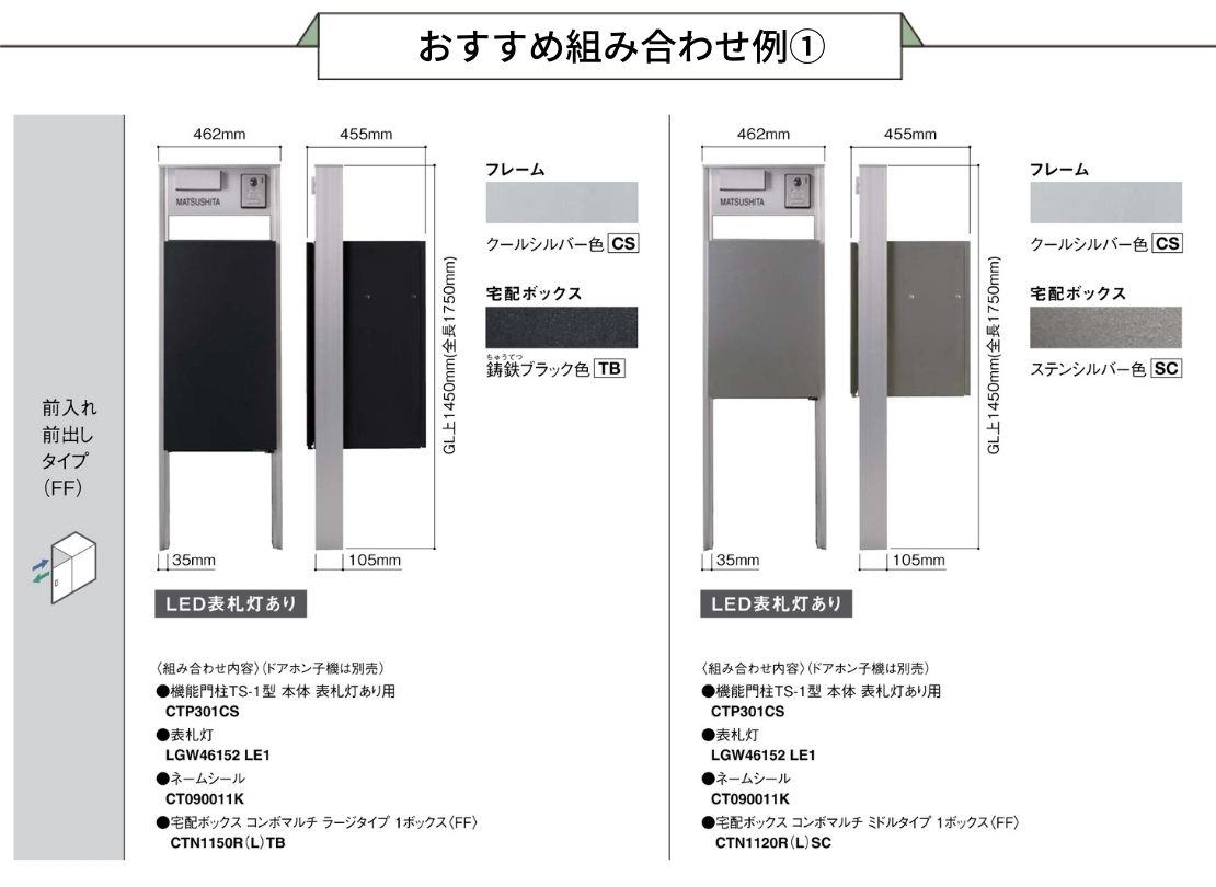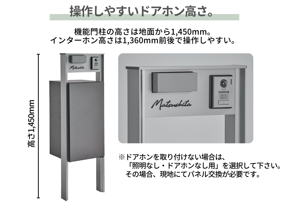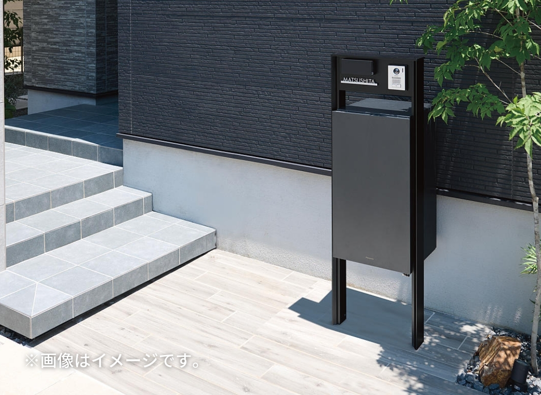 新築やリフォームでポスト一体型宅配ボックス「コンボマルチ」を導入したい方にぴったりの機能門柱です。スリムなフレームでボリュームのあるボックスを美しく見せ、夜間も荷物確認がしやすい表札灯や使いやすいドアホン高さを実現。玄関まわりをすっきり整えたい方におすすめです