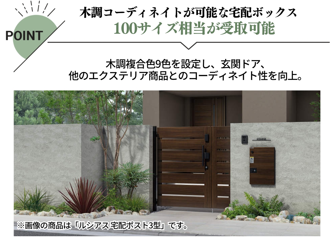 不在がちなご家庭や共働き世帯におすすめの宅配ボックスです。100サイズ相当の荷物が受け取れる大容量で、飲料ケースなど重たい荷物も安心。信頼のブランド「YKKAP」製だからこそ、耐久性や品質面も安心です。壁埋め込み仕様で玄関まわりをすっきりと見せつつ、機能性と美観を両立できます。