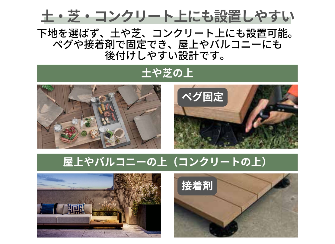 屋外空間をもっと気軽に楽しみたい方におすすめのウッドデッキです。LIXIL独自の軽量構造で女性でも持ち運びができ、プラスドライバー1本で組み立て可能。設置も土や芝・コンクリート上に対応しており、暮らしの変化に合わせて自由にレイアウトを変えられます。DIY初心者でも安心して挑戦できる設計です。