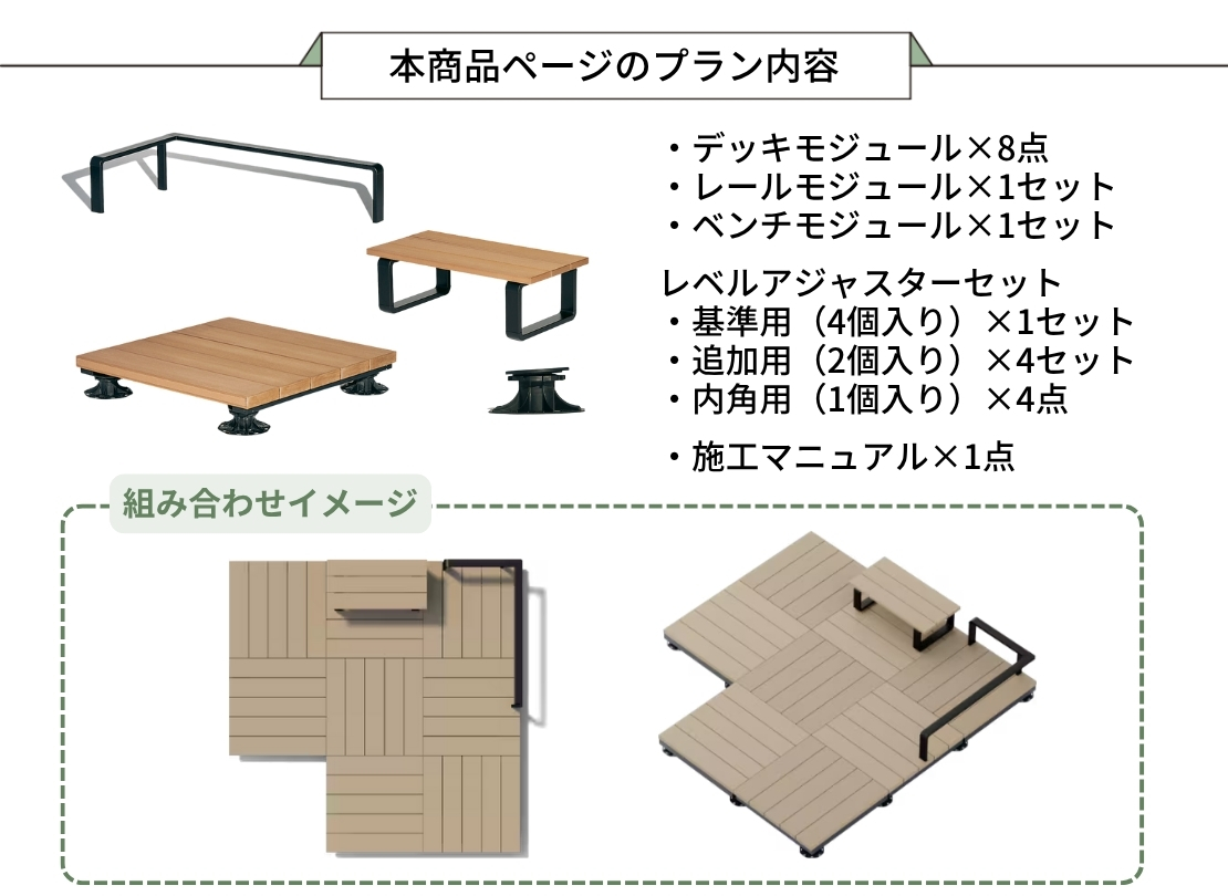ウッドデッキは、もっと自由に。使い方にあわせて、広さも形も、レイアウトは無限大。持ち運びできる5つのモジュールを組み合わせて、さあ、どんな空間をつくりあげよう。足したり引いたり、試行錯誤。カスタマイズできる幸せは、エクステリアにだってあるべきなんだ。晴れた空の下、今の自分にぴったりなスタイルを表現しよう。