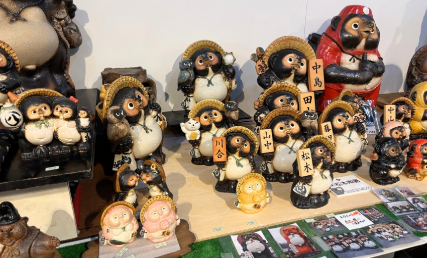 - 表札や忍者などさまざまなデザインのたぬきの置き物