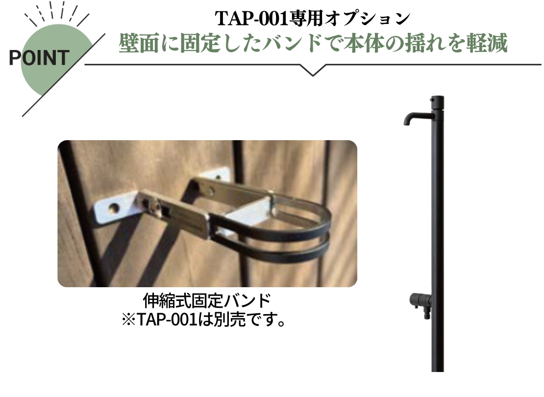 TAP-001のデザイン性を損なわずに、設置時の安定感を高めたい方におすすめの専用バンドです。ステンレス製で錆びにくく、ブラックのカラーが立水栓と統一感を演出。壁面にしっかり固定することで、本体の揺れやぐらつきを軽減します。シンプルながらも仕上がりに差が出る、安心感あるオプションです。