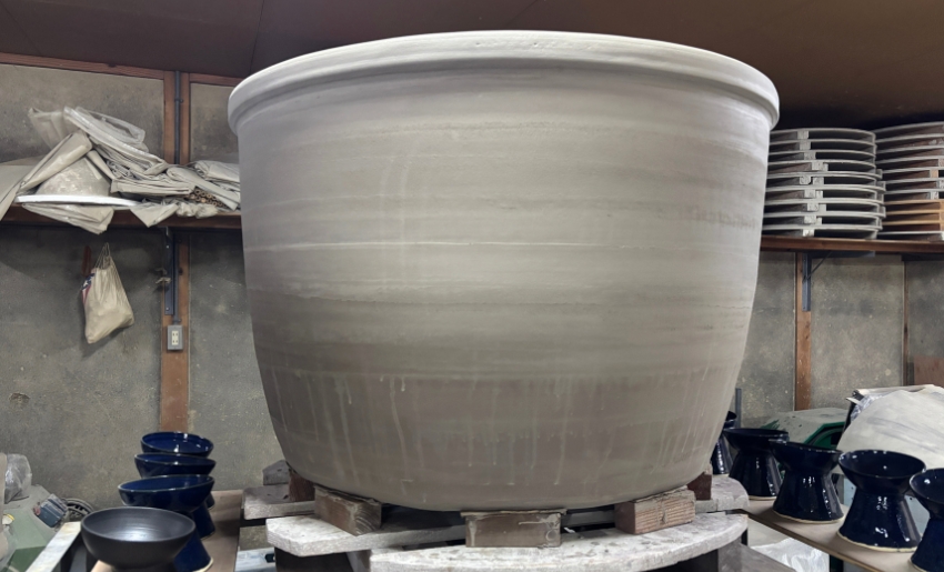 豊島:丸型浴槽で、φ1,400くらいになると他のところでは手ひねりで作るところが多いと聞きました。でも小谷さんは、φ1,400もφ1,500もろくろで行けると。