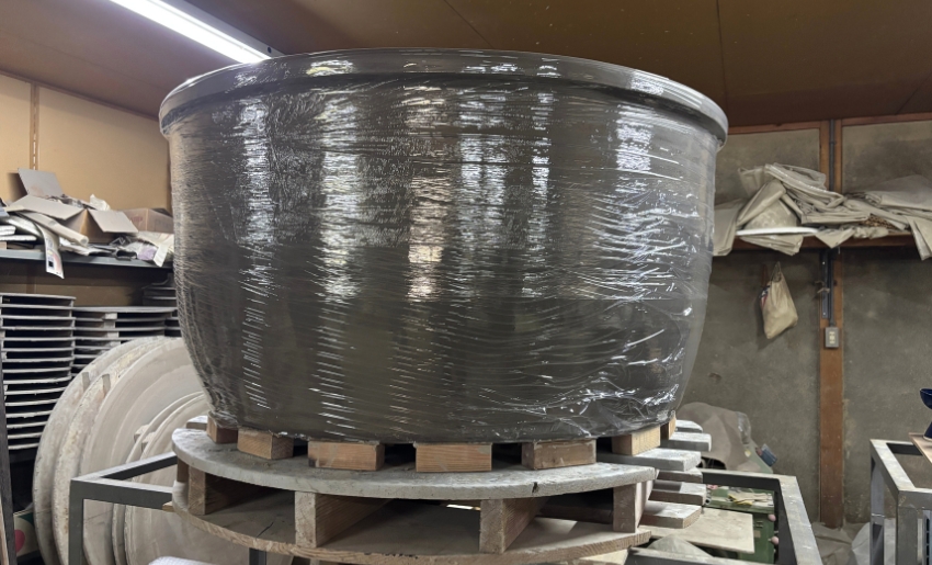 - 丁寧な手仕事で作られる信楽焼浴槽。これは釉薬をかける前の状態。