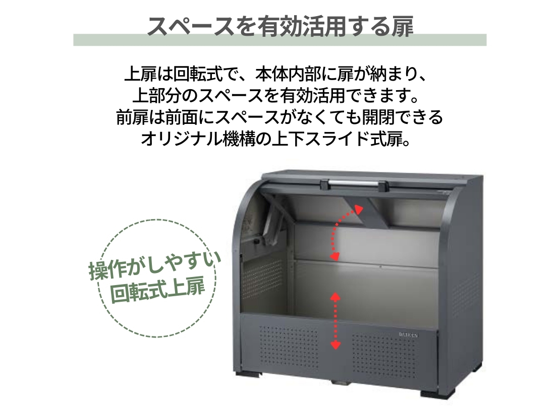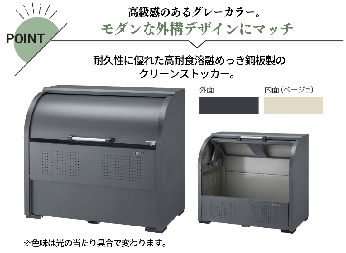 モダンな外観にこだわる集合住宅のオーナー様・管理会社様におすすめのごみストッカーです。深みのあるシックなグレーが建物のデザインに美しく馴染み、景観を損ねないのが魅力。高耐食めっき鋼板や静かな回転式上扉、掃除しやすい底板構造など、長期運用で差が出る機能性もしっかり備えています。