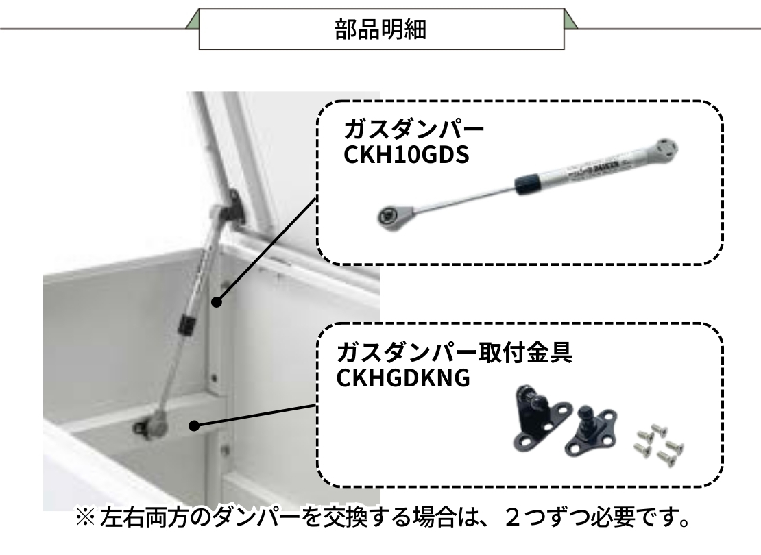 クリーンストッカーCKH-Bを安心して長く使いたい方に向けた、純正のメンテナンス部品です。扉の開閉を支えるガスダンパーは左右に1本ずつ搭載され、2万回の開閉試験にも合格した構造ですが、使用環境によっては交換が必要になる場合があります。純正部材なら適合性を気にせず取り替えられ、スムーズな動作を維持しやすい点が魅力です。