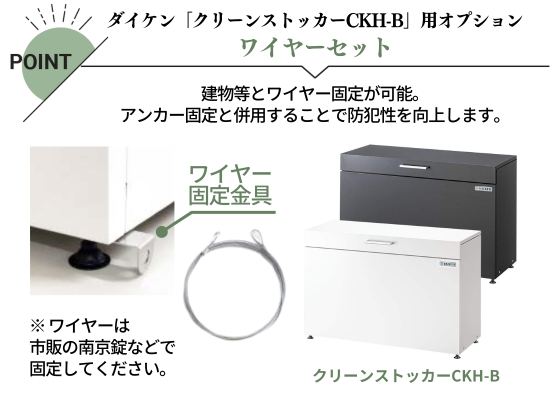 クリーンストッカーを建物とワイヤーで固定できる、防犯性向上のためのオプションセットです。アンカー固定と併用することで、いたずらや盗難リスクを軽減でき、共用部や人通りの多い場所にも安心して設置できます。ステンレス製の固定金具とワイヤーが付属し、屋外でも長く使いやすい仕様です。