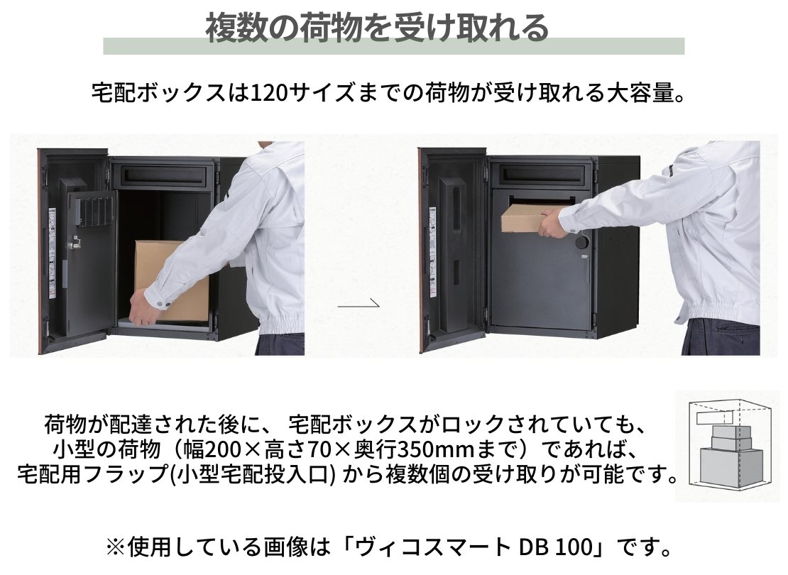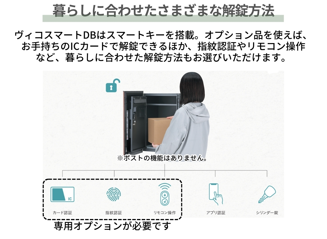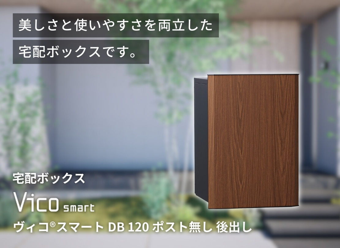ヴィコスマートDB120は、宅配120サイズまで対応できる大容量タイプで、留守が多いご家庭や通販利用が多い方に向いた宅配ボックスです。施工時に外扉を外せる後付け構造のため、仕上がりをきれいに整えやすい点も現場目線では嬉しいポイント。スマートキーを標準搭載し、アプリ解錠に加えて非常時はシリンダー錠でも対応可能。使い勝手と施工性のバランスが取れた一台です。