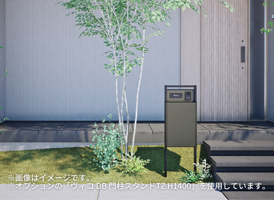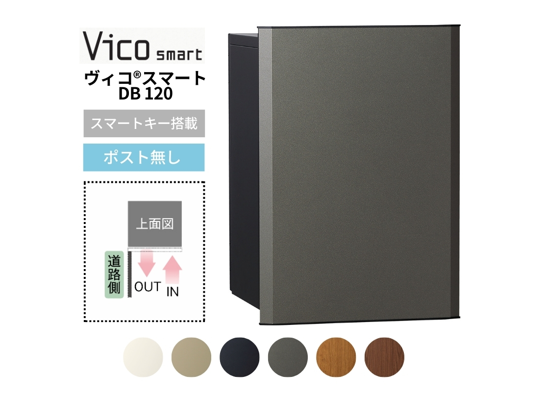 ヴィコスマートDB120は、宅配120サイズまで対応できる大容量タイプで、留守が多いご家庭や通販利用が多い方に向いた宅配ボックスです。施工時に外扉を外せる後付け構造のため、仕上がりをきれいに整えやすい点も現場目線では嬉しいポイント。スマートキーを標準搭載し、アプリ解錠に加えて非常時はシリンダー錠でも対応可能。使い勝手と施工性のバランスが取れた一台です。