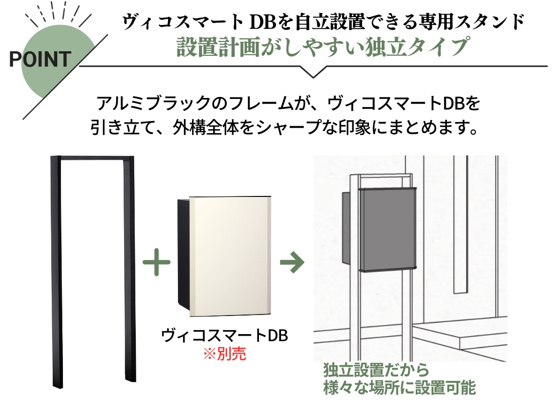 ヴィコスマートDBを独立設置できる専用スタンドです。すでにポストが設置されている場合でも、後から宅配ボックスを追加しやすい独立タイプ。アルミブラックの直線的なフレームが本体を引き締め、外構全体をシャープにまとめたい方に向いています。新築時はもちろん、後付け設置にも対応しやすいスタンドです。